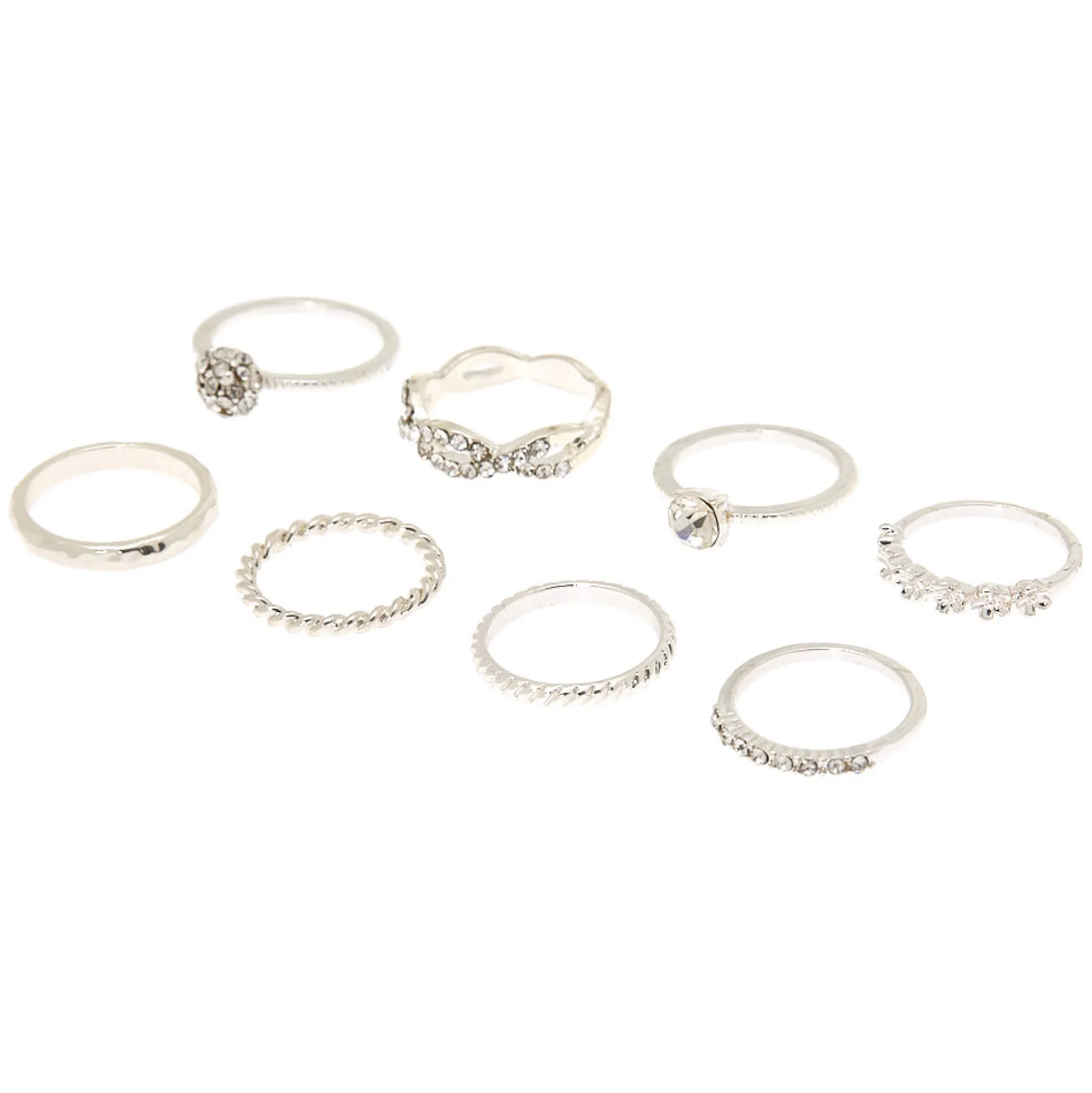 Go for sparkle and shine with this ring set! Ring set features a variety of designs including infinity rings, textured rings, and a fireball designed ring! Easily mix and match with this ring set.