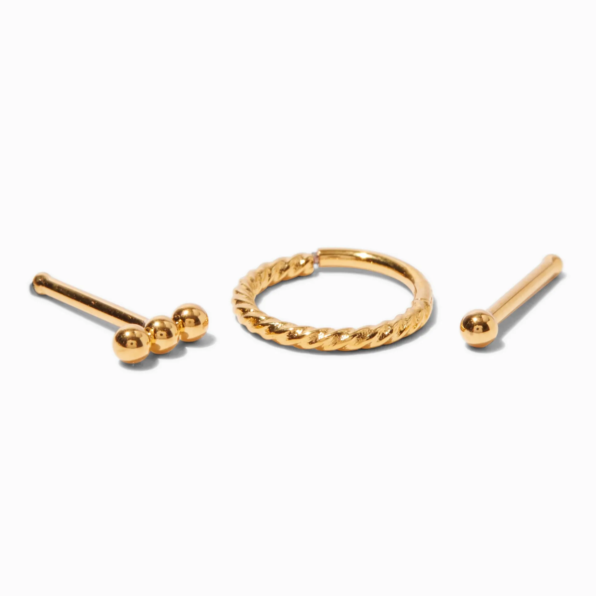 Go for gold in this nose hoop set. It includes two studs and one hoop with ball shapes and twisted details.