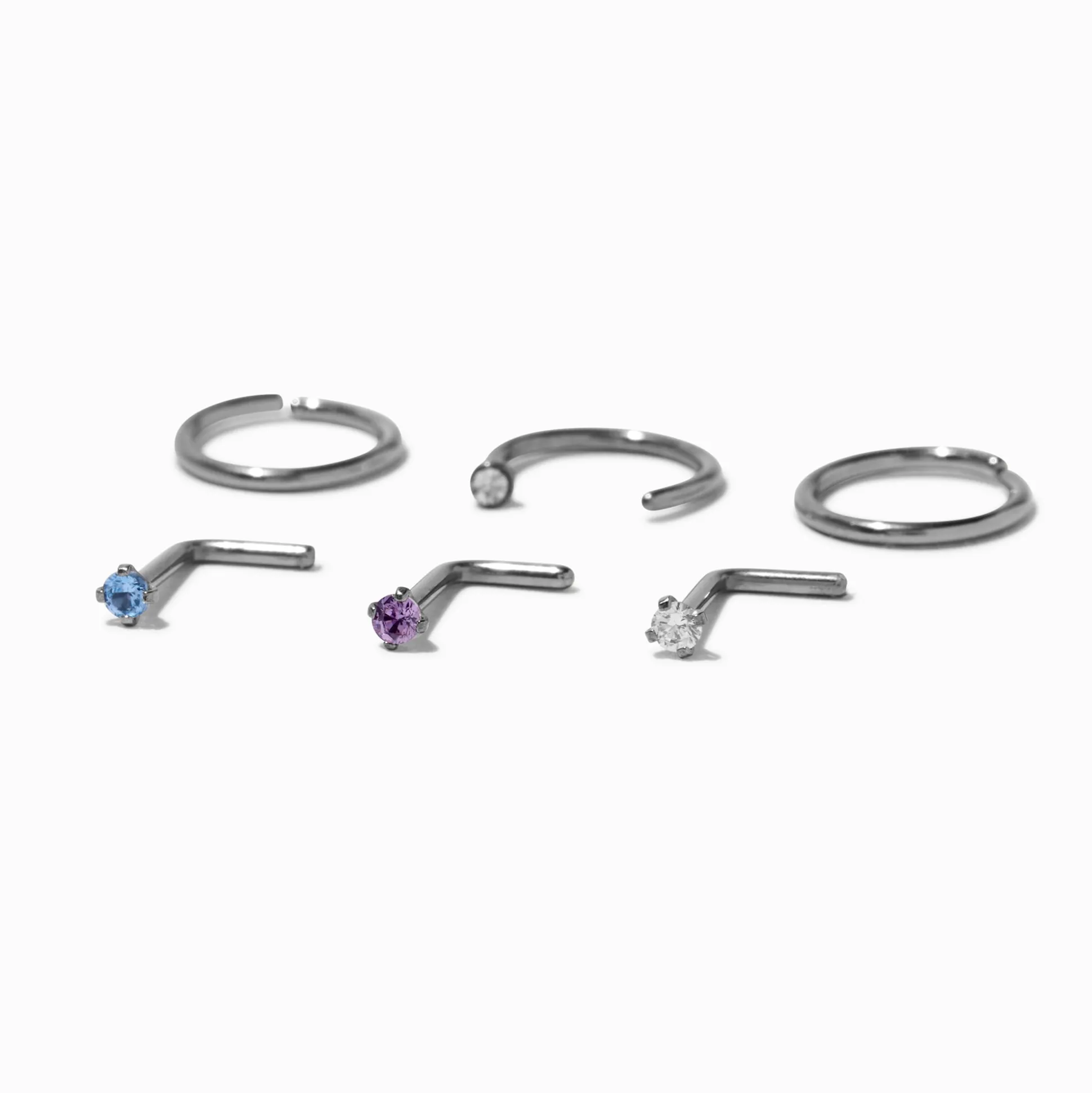 18G Silver-tone Titanium Cubic Zirconia Mixed Aqua Nose Rings – 6 Pack