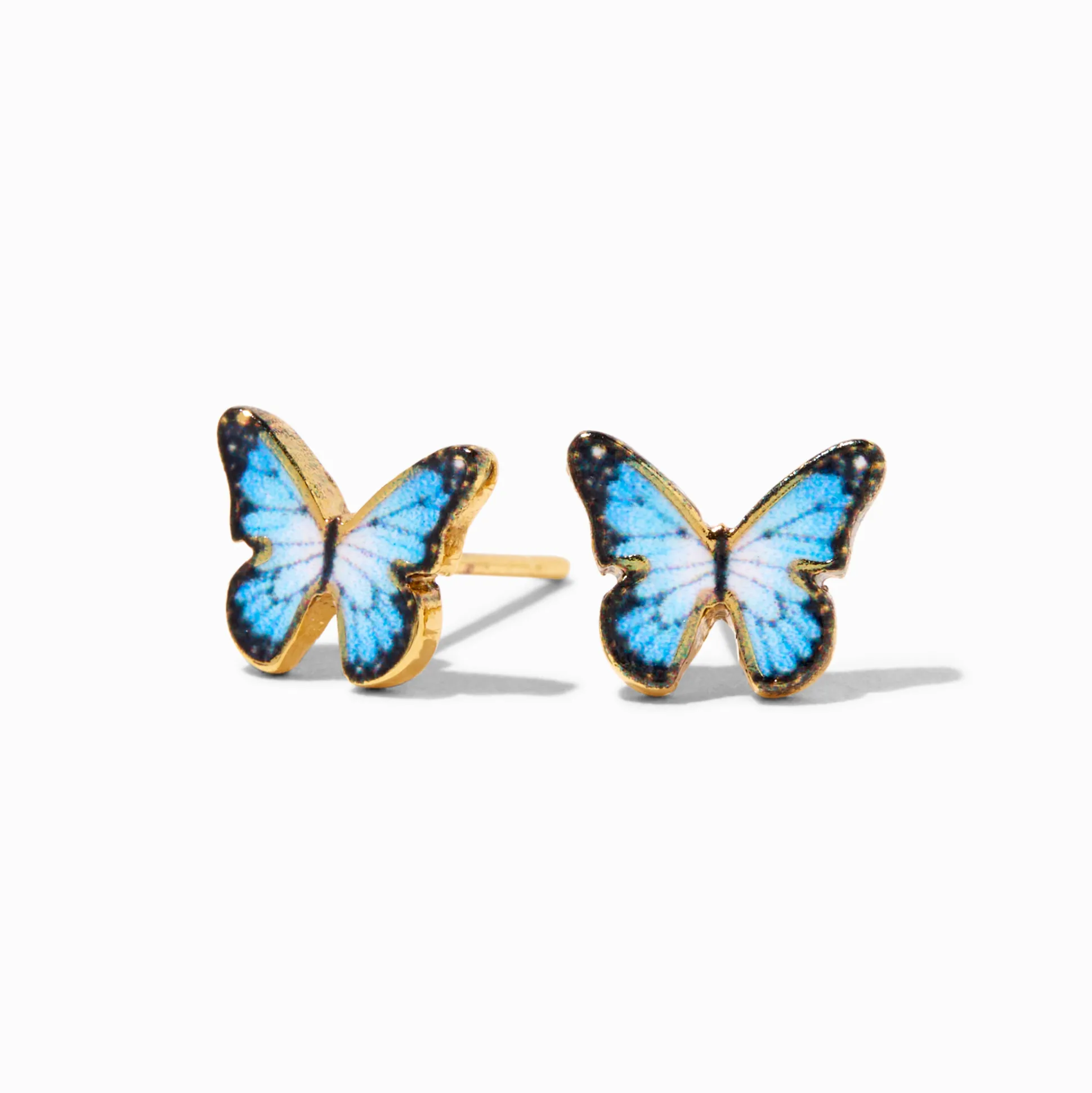 If you love butterflies, then these earrings are a must-have! This pair of gold-plated stud earrings features a blue monarch butterfly design.