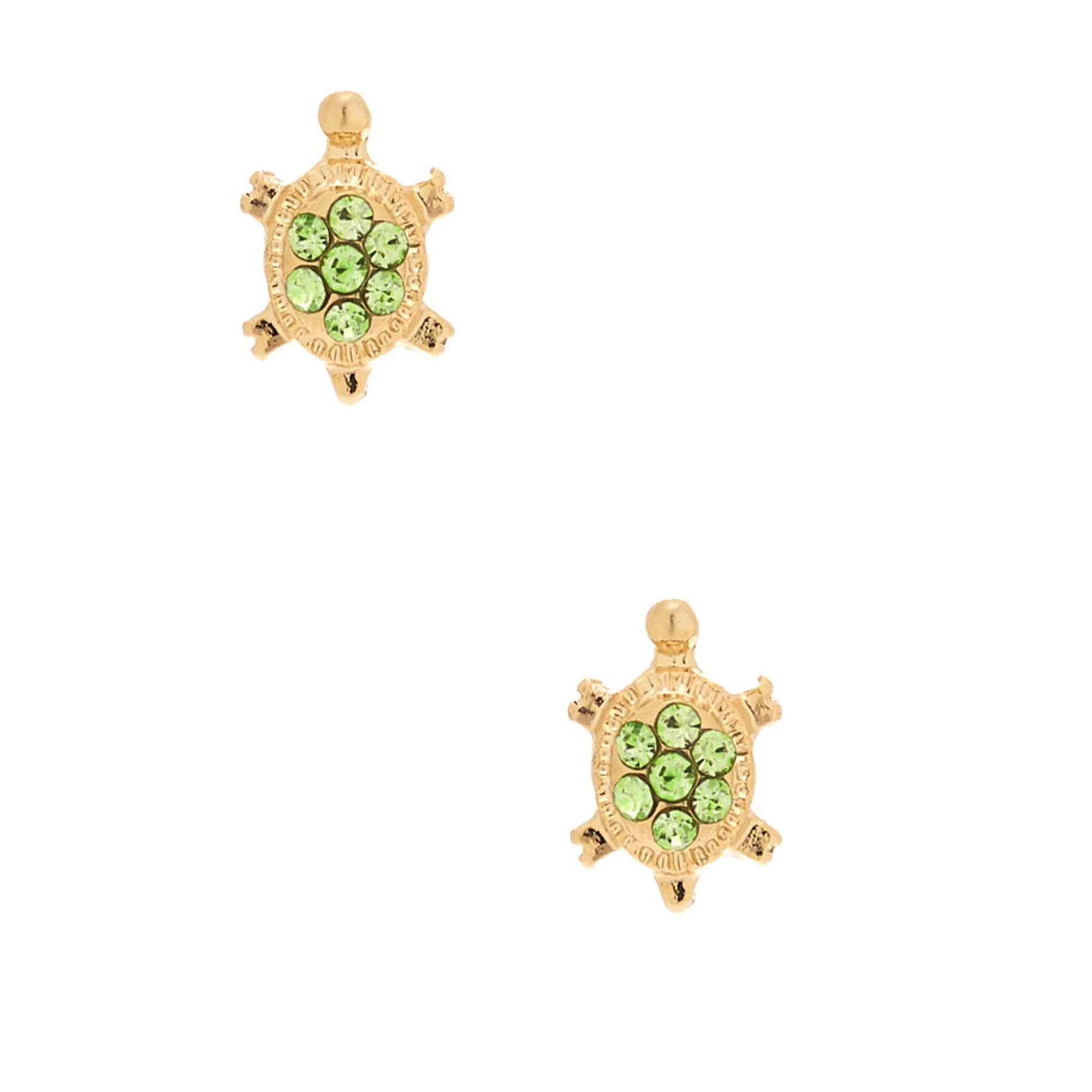 Add a pop of sparkle to your ears when you wear these stud earrings! Perfect summer accessory, these gold plated earrings feature a turtle on each stud with gorgeous green faux crystals.