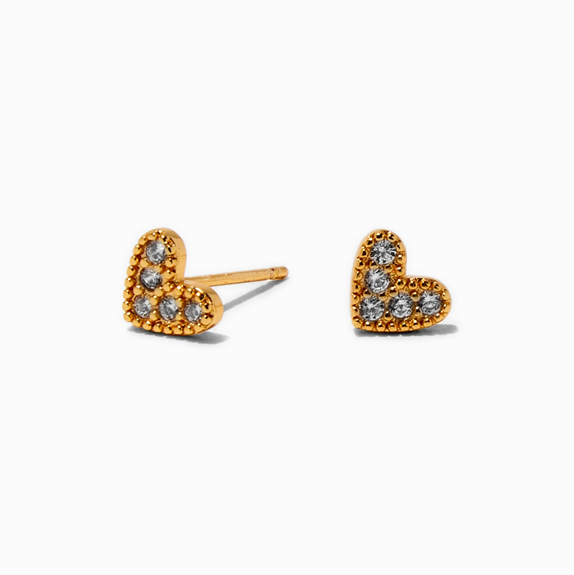 Always have the perfect pair of earrings with this set of studs. These cuties have a gold plated heart design with cubic zirconia stones.