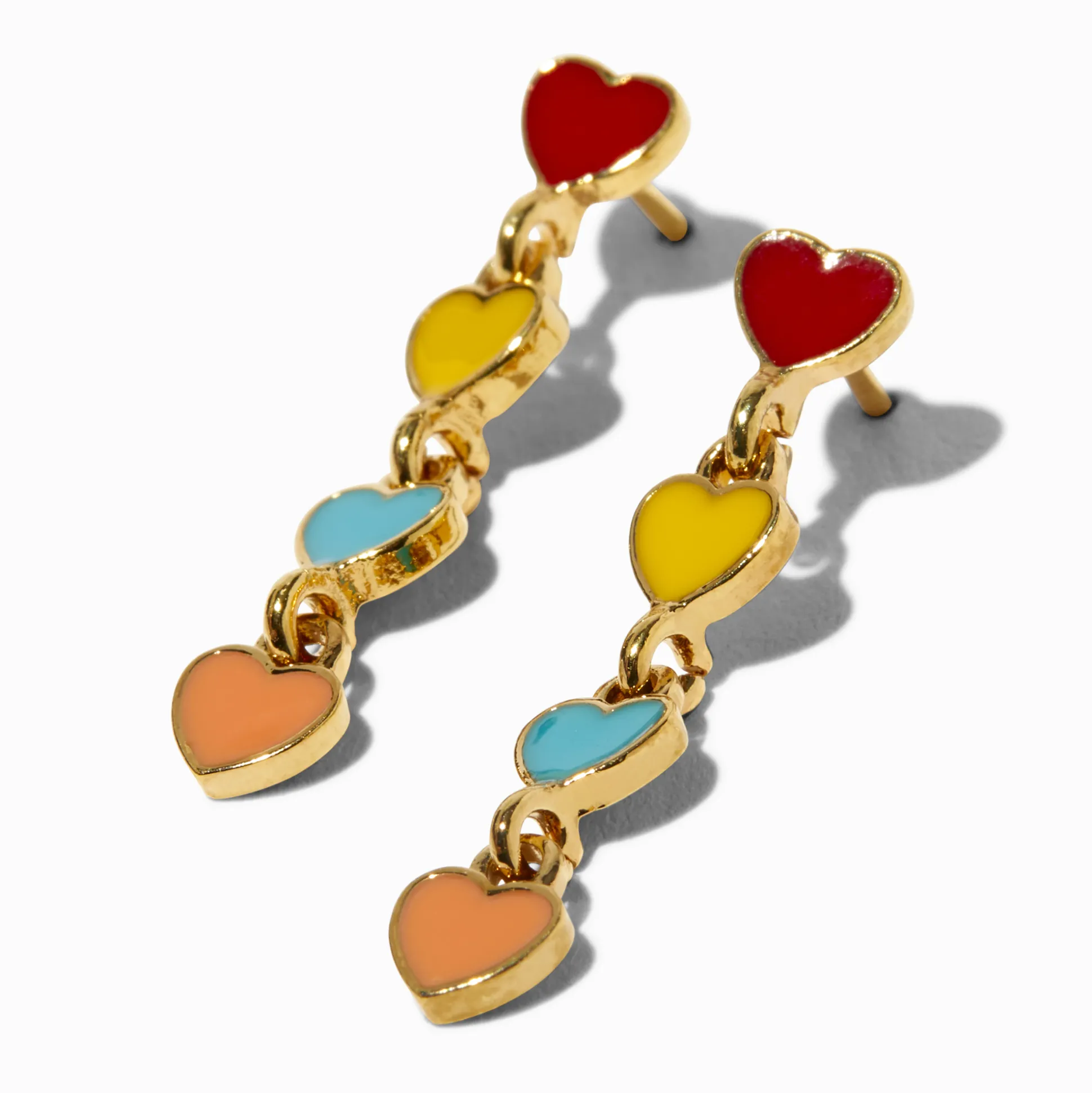 There is so much to love with these linear drop earrings! The 18kt gold-plated earrings have a linear row of enamel hearts in rainbow colors.