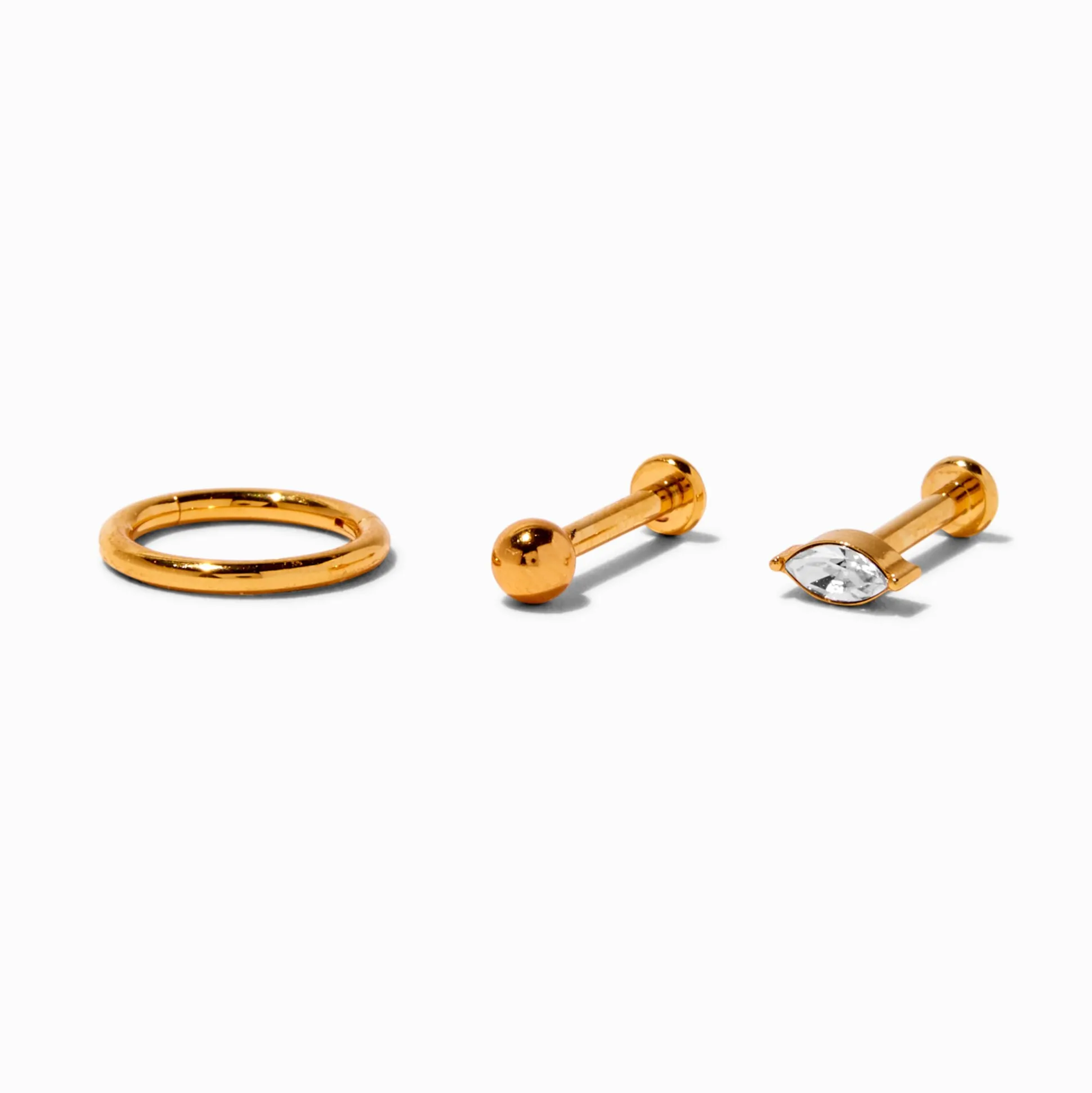 Three options are better than one! This must-have titanium cartilage earring set includes a ball stud, a marquise-shaped faux crystal stud, and a plain hoop.