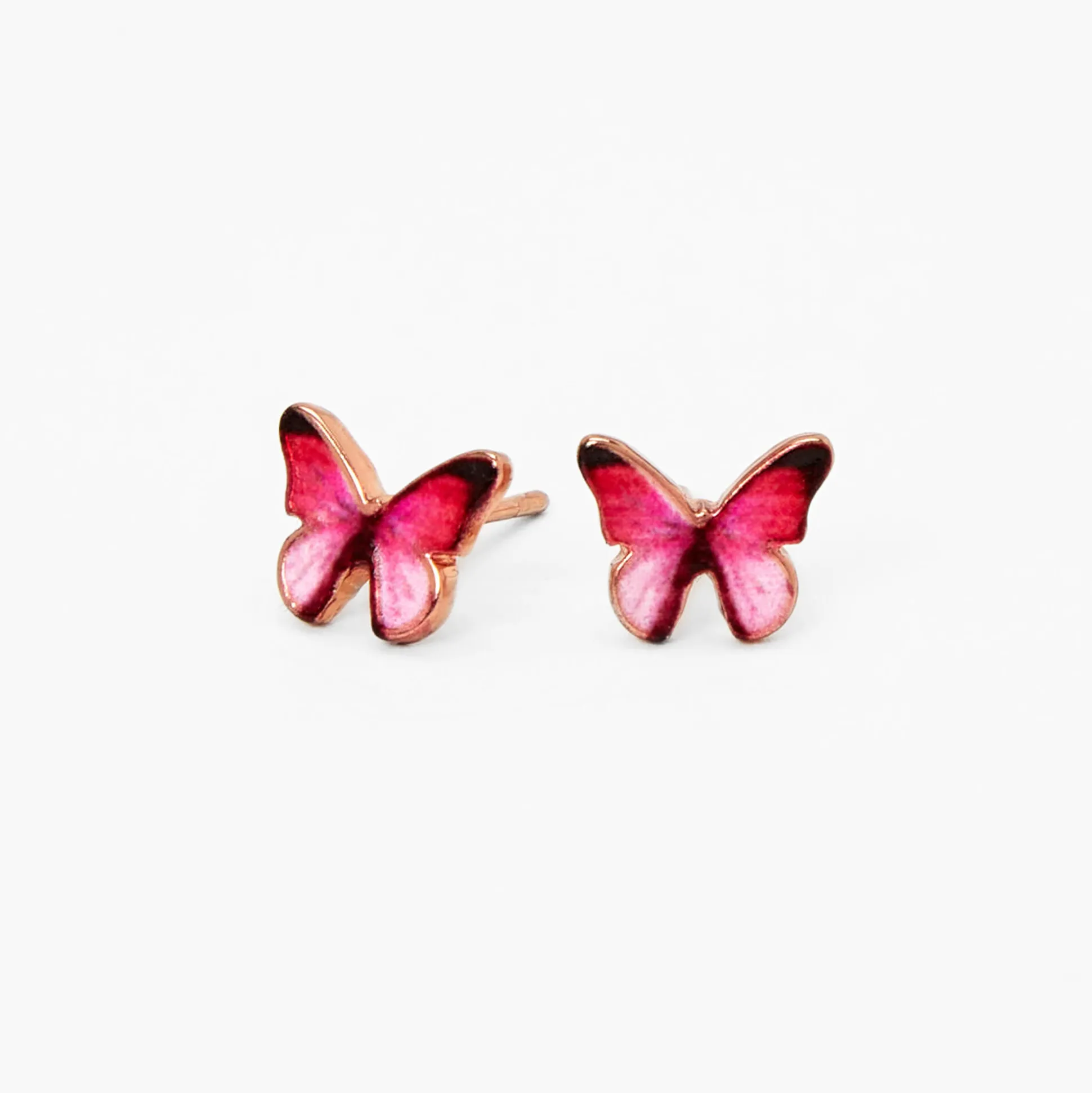 If you love butterflies, then these earrings are a must-have! This pair of rose gold plated stud earrings feature a beautiful pink butterfly design.