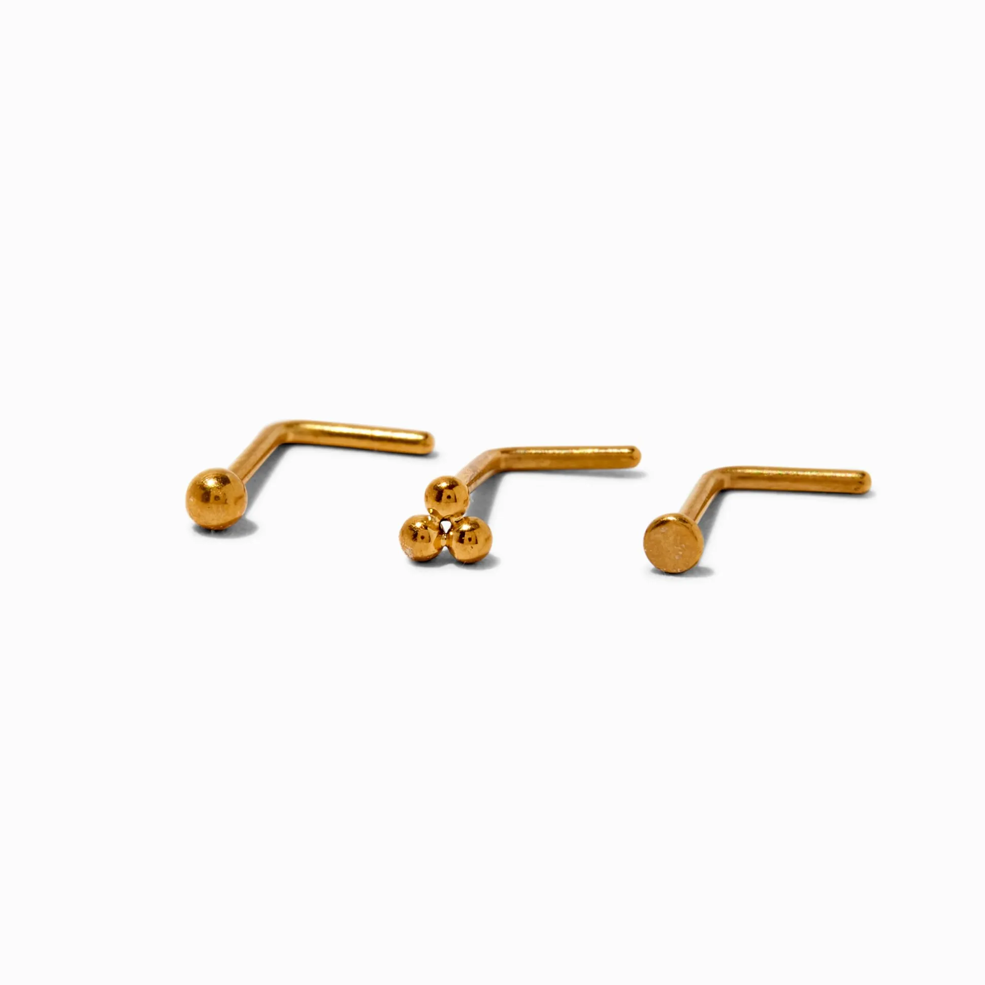 This basic everyday nose ring set is classic and timeless! The gold-plated titanium set includes 3 nose studs with a ball design, a tri-ball design, and a flat nail design.