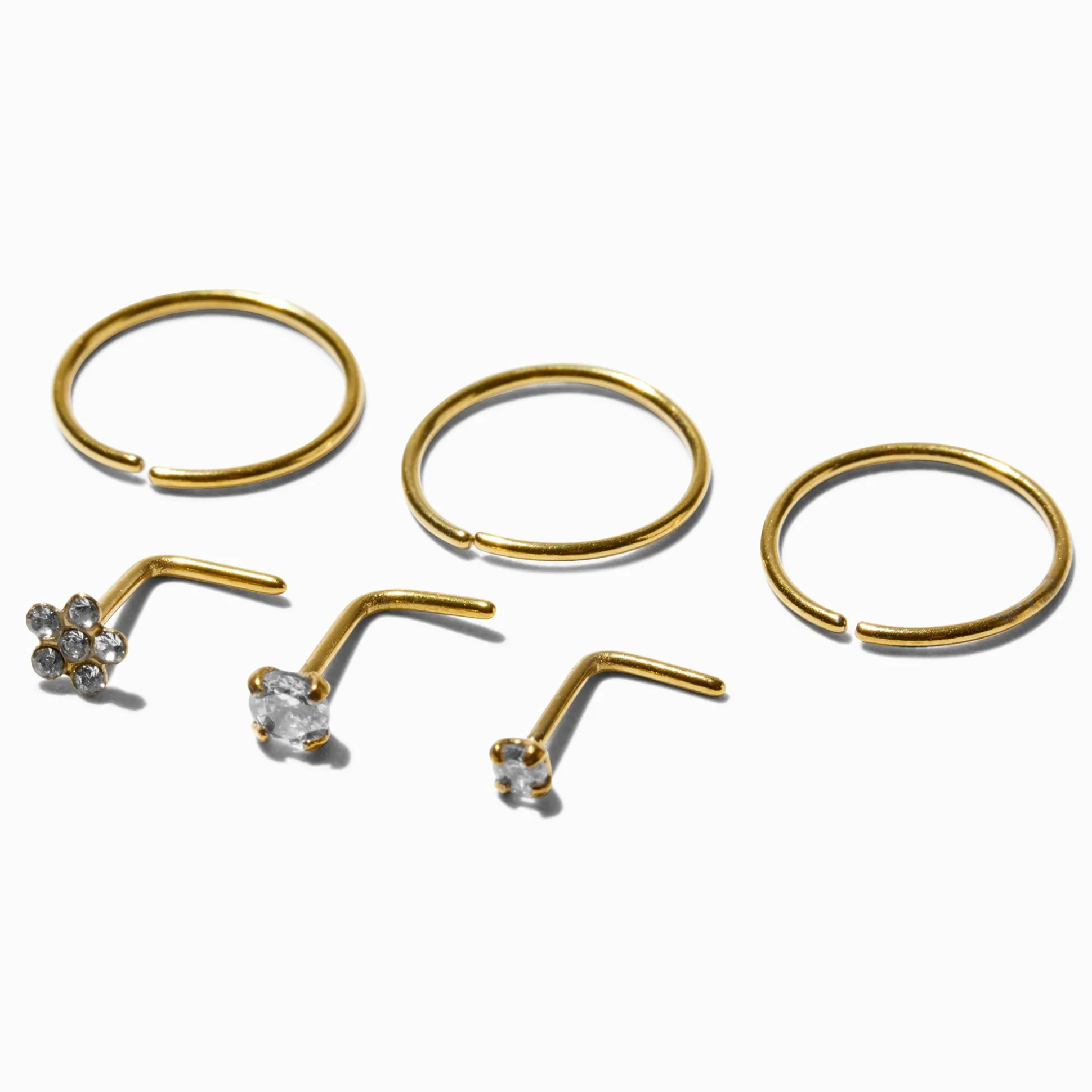 Expand your nose jewelry collection with this stunning six pack. It includes three studs with faux crystals in square and daisy shapes and three plain hoops.