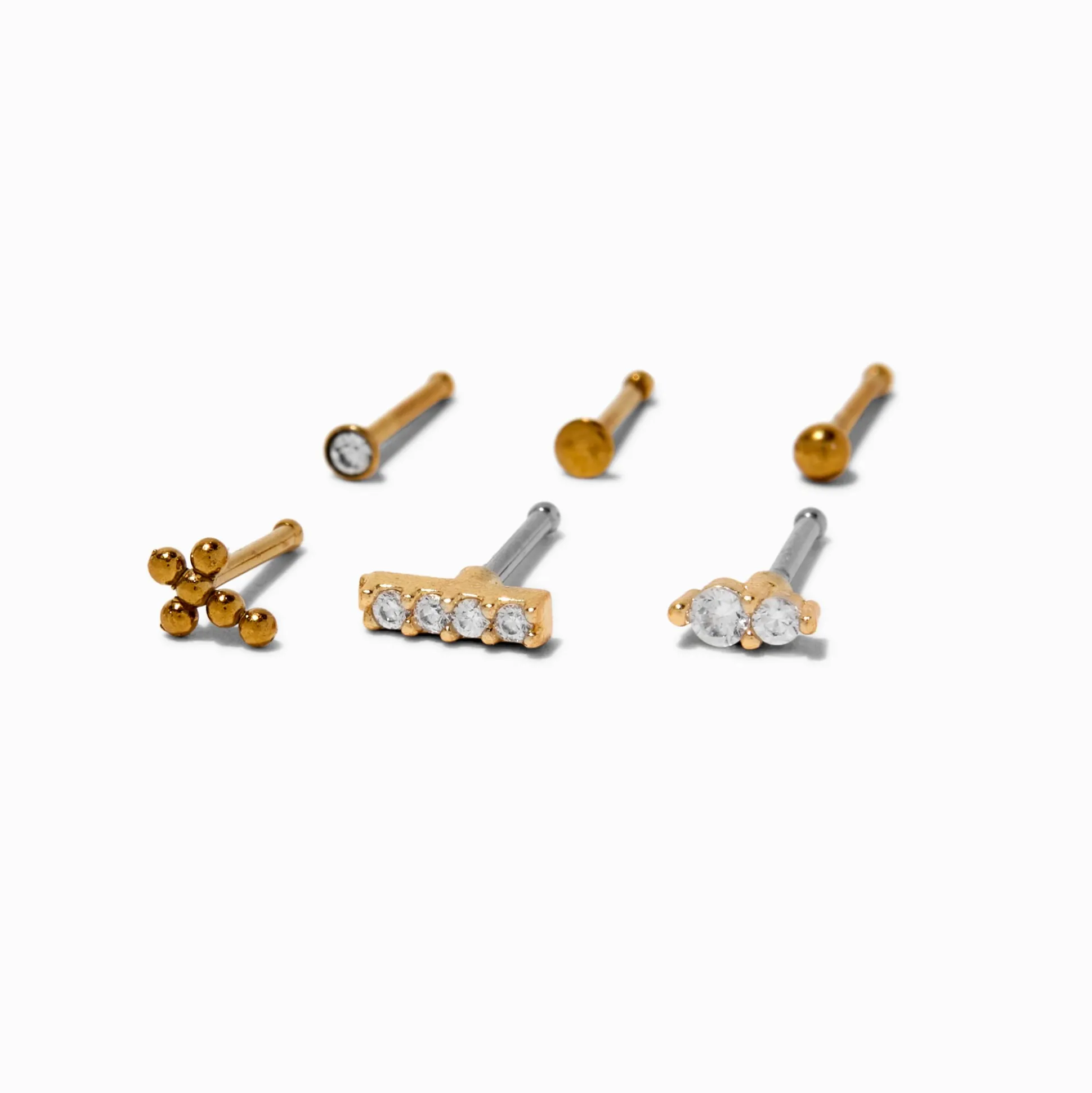 Never run out of sparkling nose studs! This multi pack includes six studs with cubic zirconia embellishments and different shaped designs with gold-colored stainless steel posts.