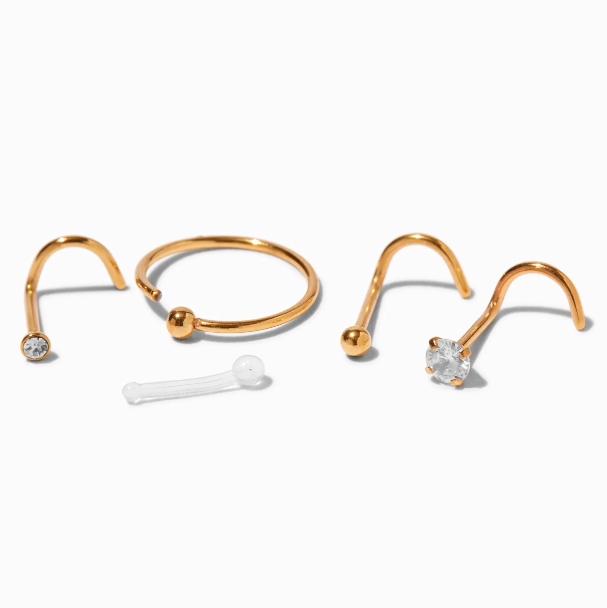 Show off your individuality with this six-pack nose jewelry set. Options include three gold-tone corkscrew posts with a prong-set diamante, a bezel-set diamante, a gold-tone ball, one hoop with a gold-tone ball, and a plastic retainer stud.