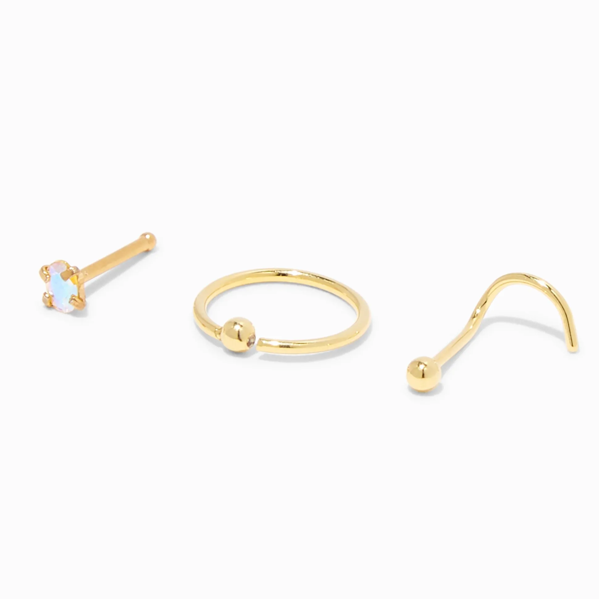 Expand your nose jewelry collection with this stunning three pack. The stainless steel set has a stud with an AB iridescent crystal and a stud and hoop decorated with a ball design.