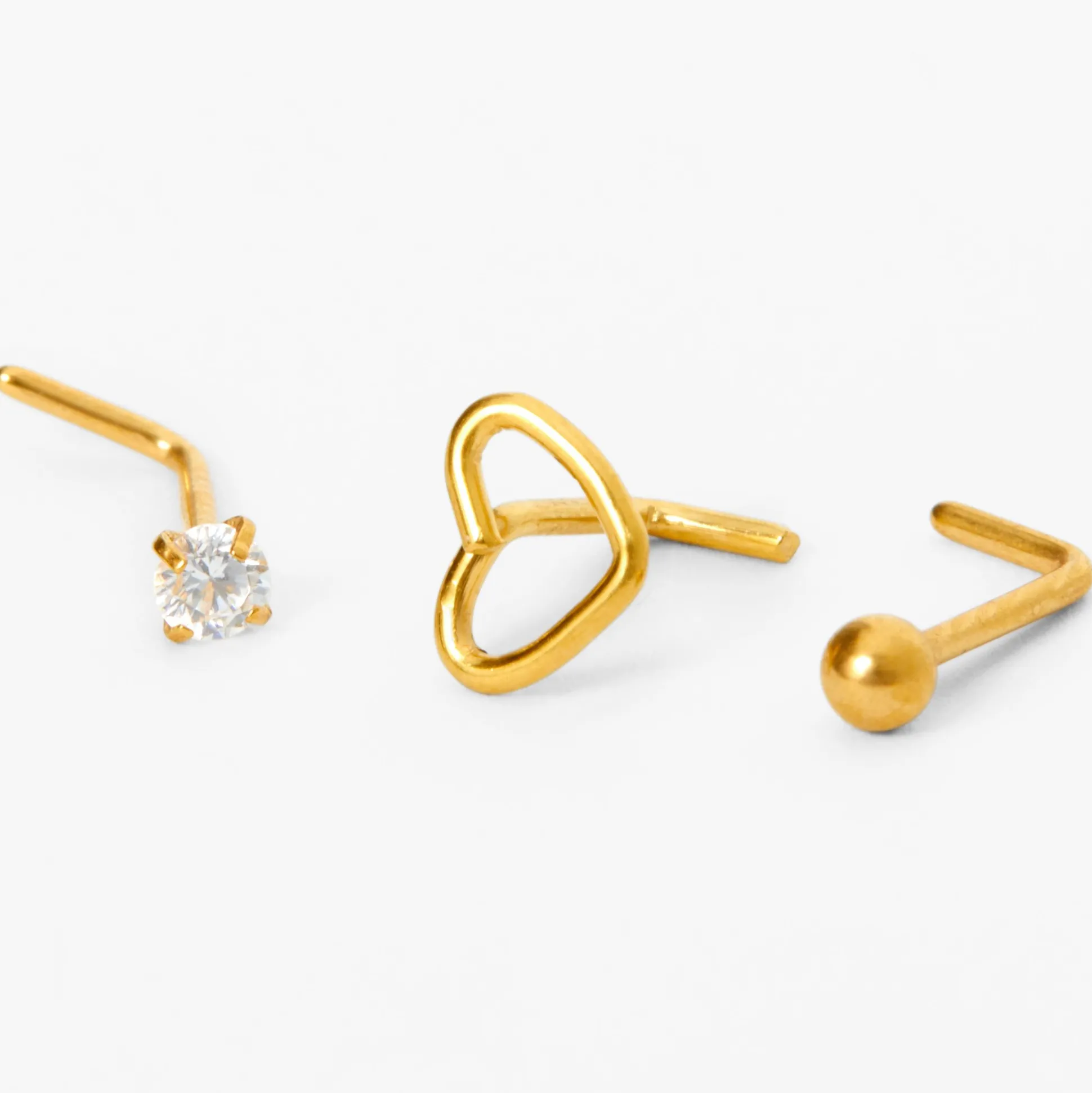 This dainty heart outline adds a unique look to your nose jewelry collection! The gold-tone titanium set of three nose rings also includes a single ball stud and a single faux crystal stud.