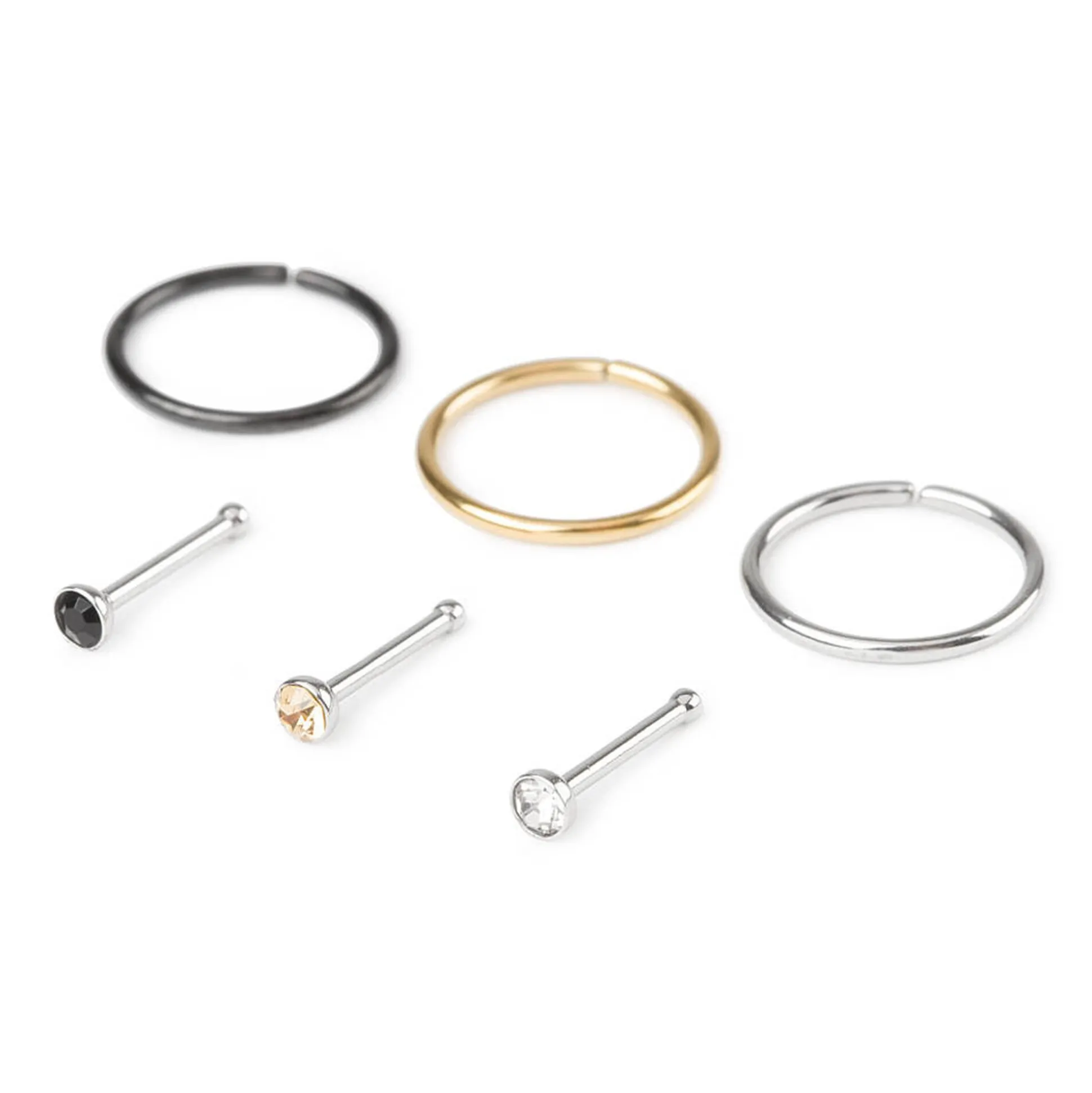 This coordinating set gives you plenty of variety. Includes nose hoops in silver, black, and gold, as well as crystal studs in clear, black, and gold.
