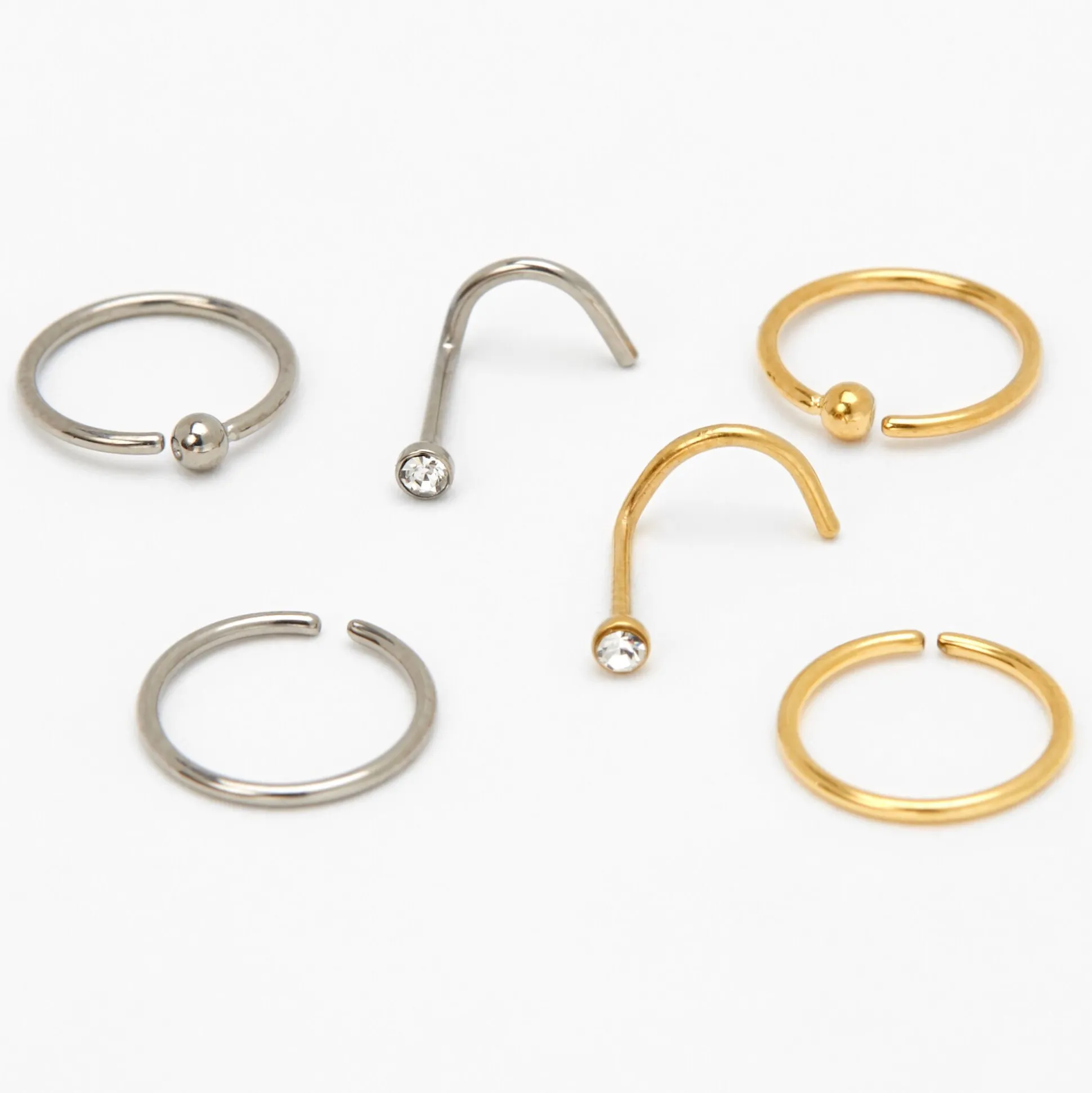 Switch up your nose jewelry with this set! This mixed metal set includes 4 hoop nose rings and 2 stud nose rings with sparkly faux crystals and balls in gold and silver-tone.
