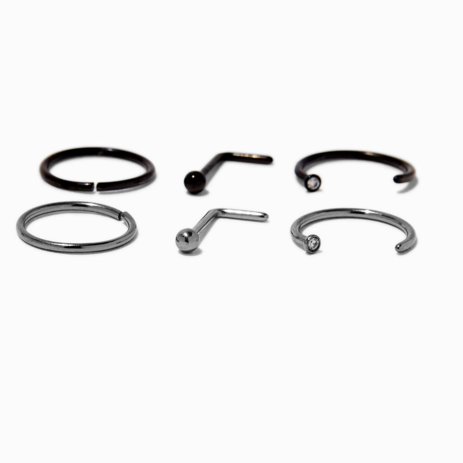 Show off your individuality with this six-pack nose jewelry set. Options include silver-tone or black rings and studs.