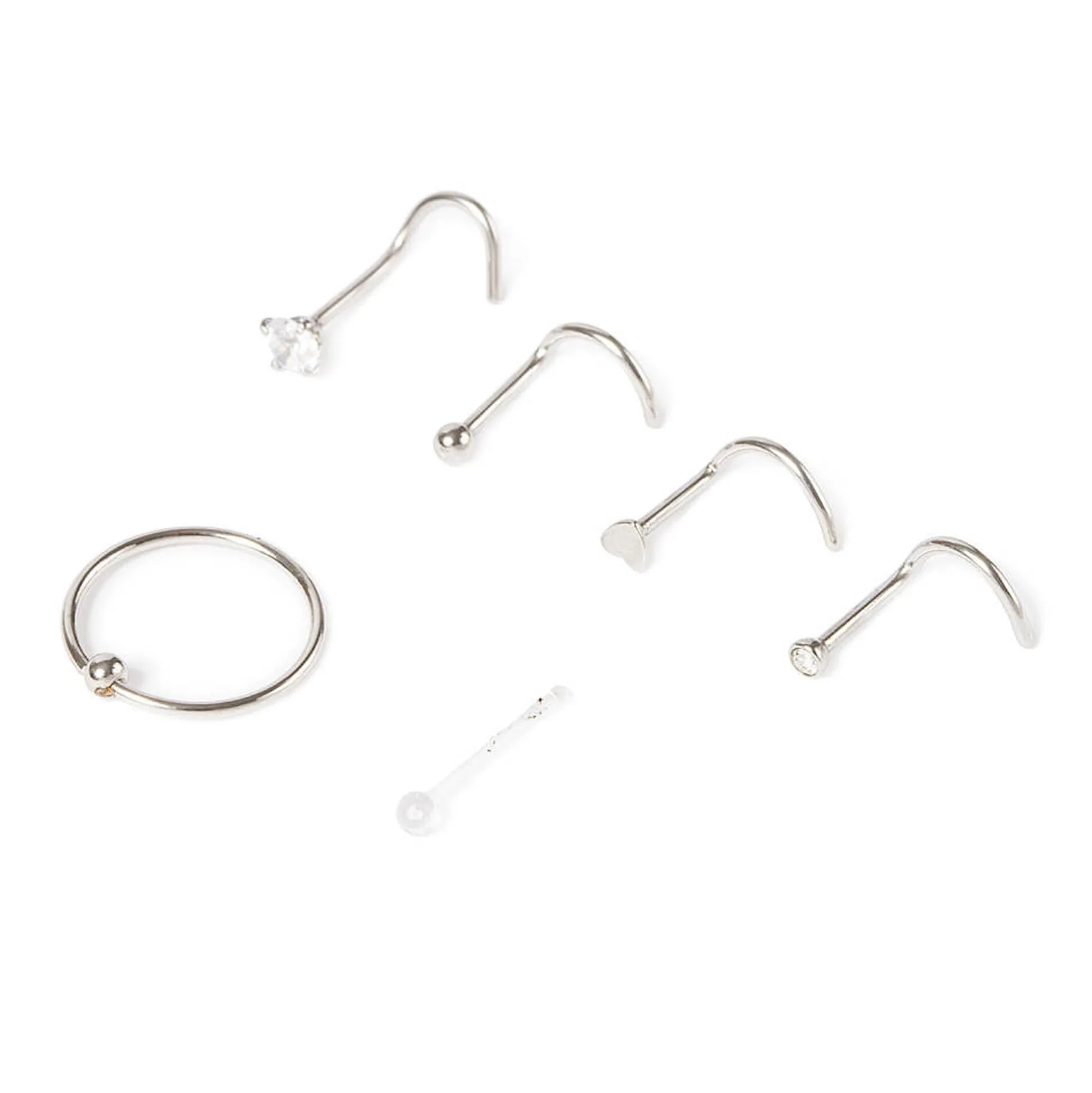 This set includes assorted stud and nose rings for the perfect everyday jewelry look. Styles include 5 different stud nose rings and 1 hoop nose ring.