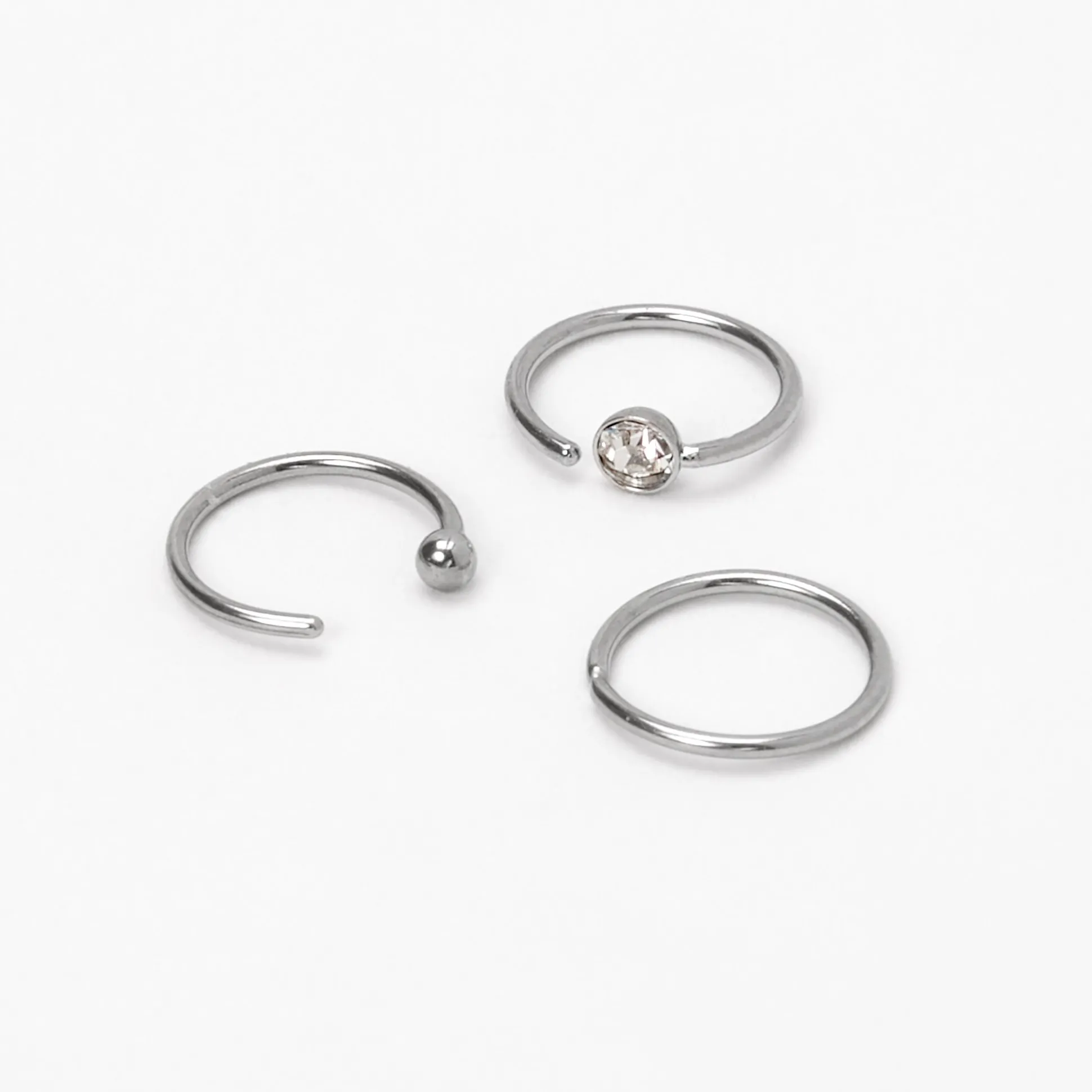 Nose jewelry that is dainty and cute! This assorted hoop nose ring set includes one sleek nose ring, one nose ring with a ball, and one nose ring with a faux crystal.