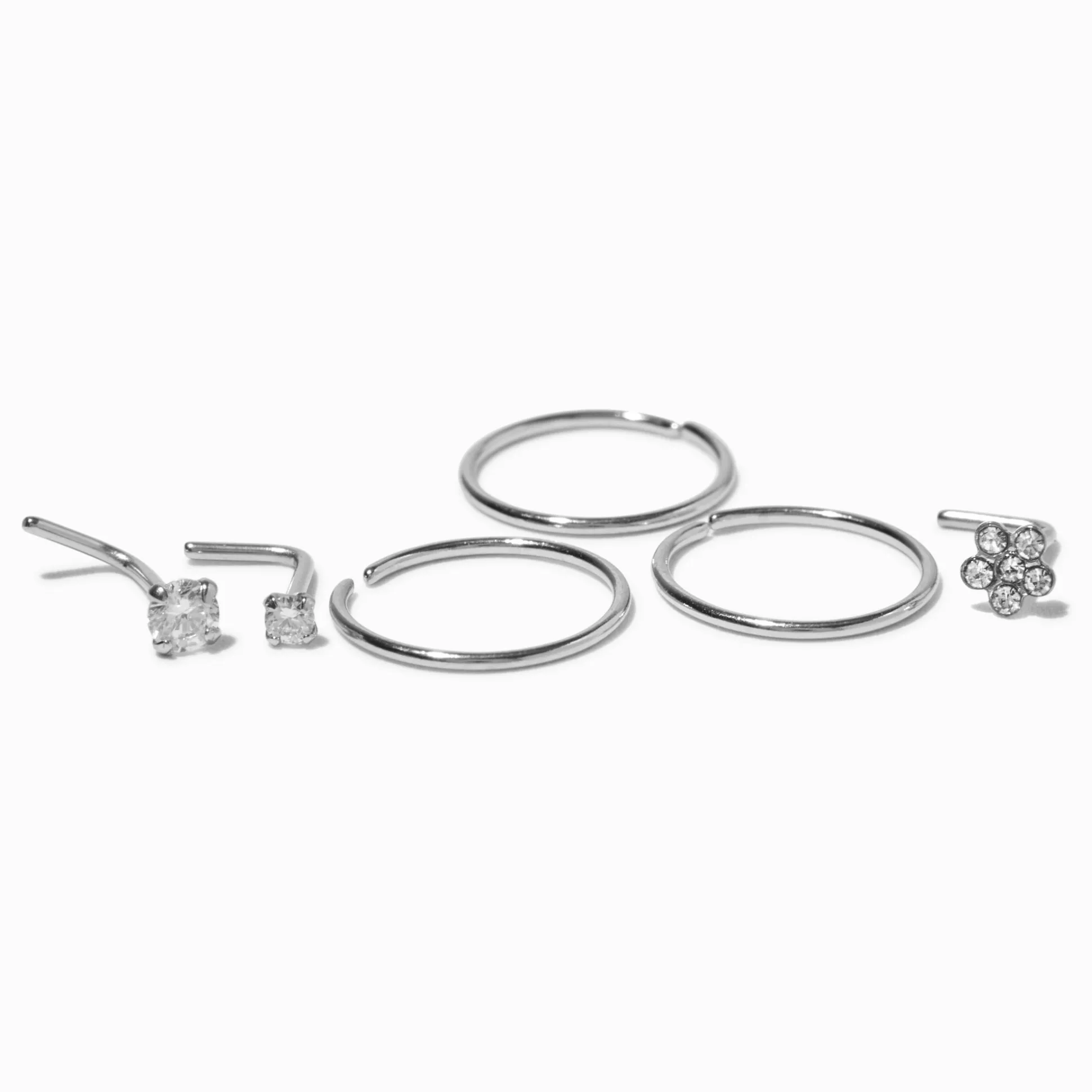 Expand your nose jewelry collection with this stunning six pack. It includes three studs with cubic zirocnias in square and daisy shapes and three plain hoops.