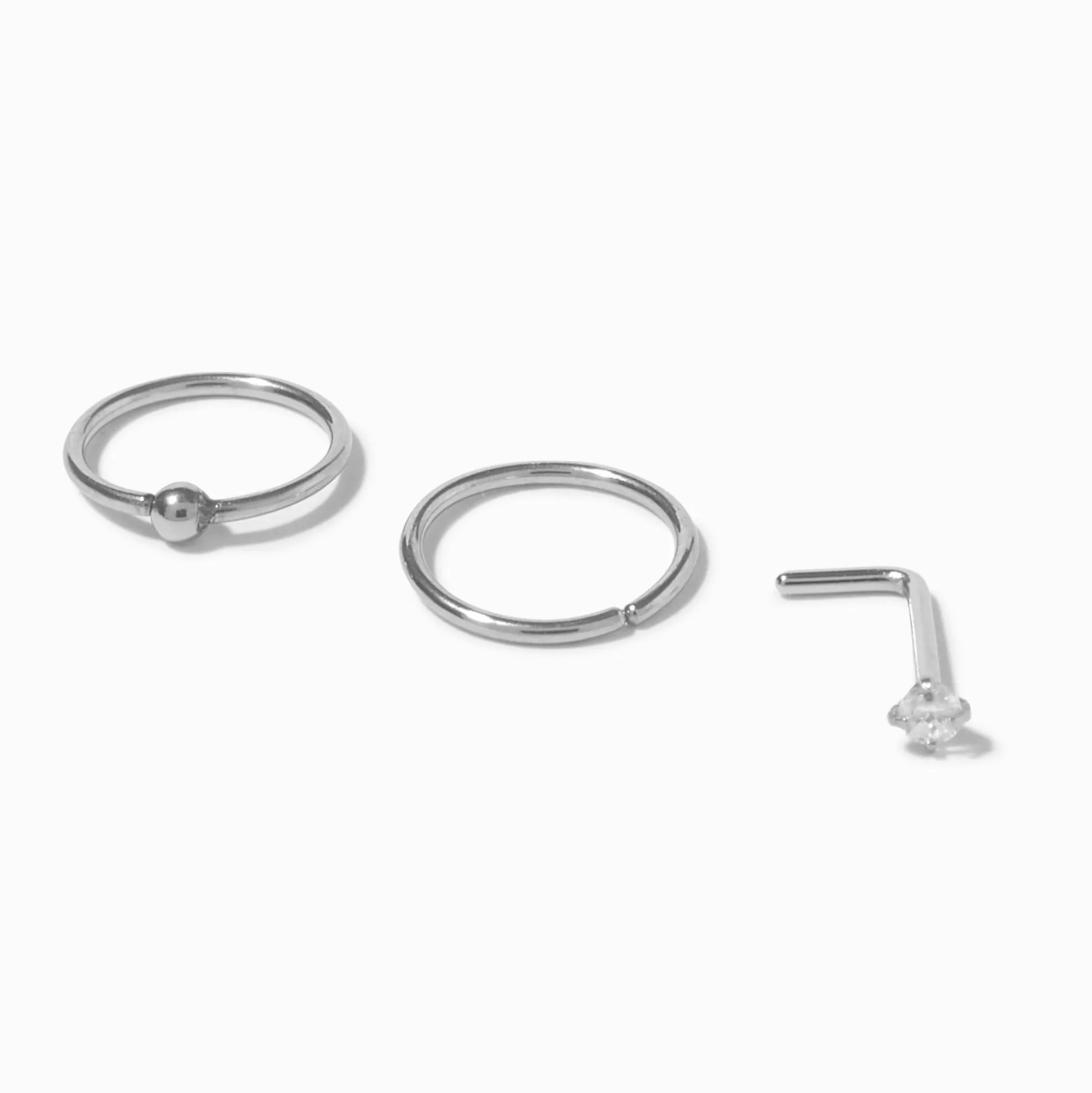 This three-piece set expands your nose jewelry collection. The stainless steel set includes two hoops and a cubic zirconia stud.