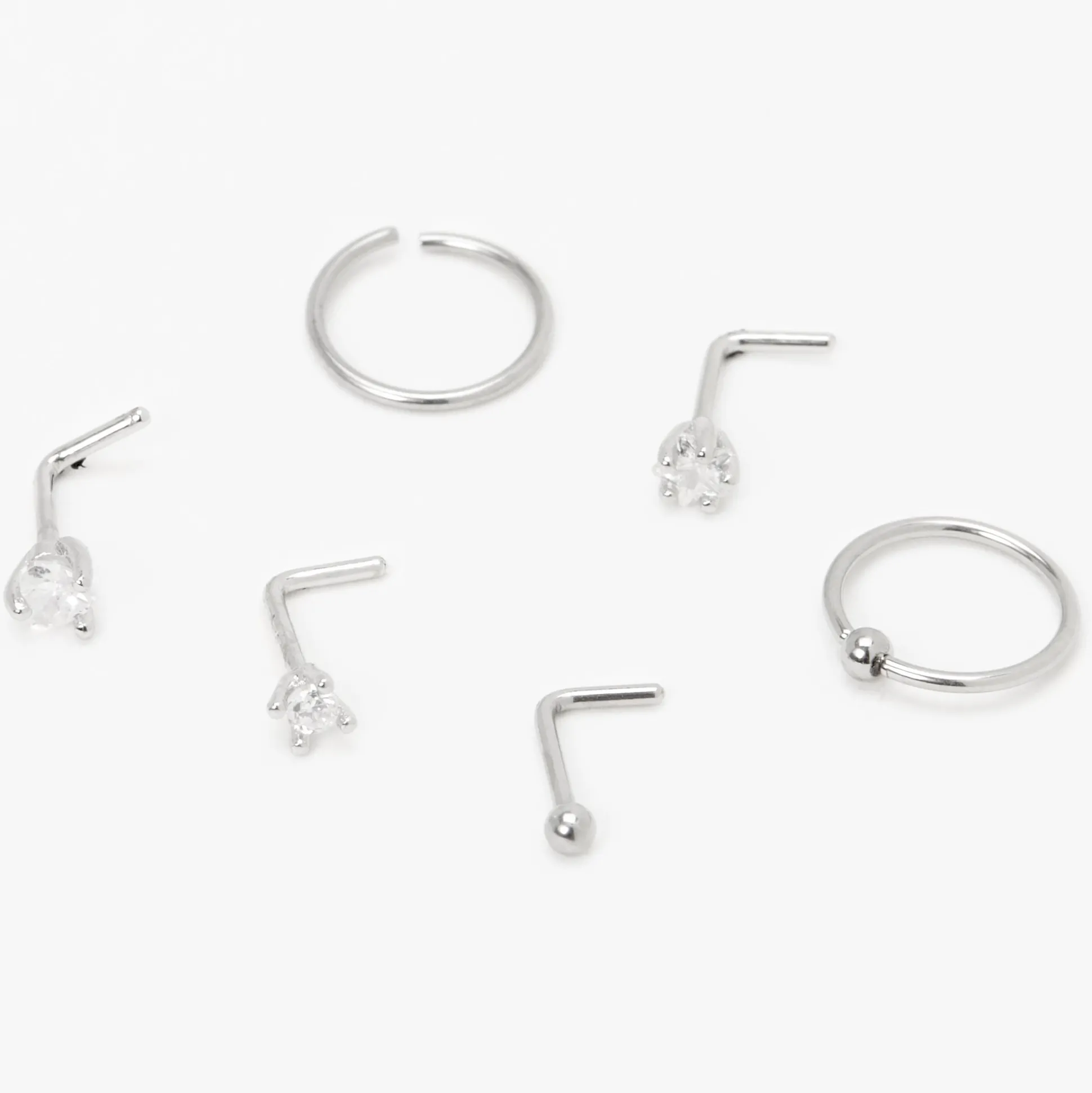 Add this set of nose rings to your jewelry collection! Mixed set includes 4 nose studs and 2 hoop nose rings with balls and faux crystal stones in round, heart, and star shapes.