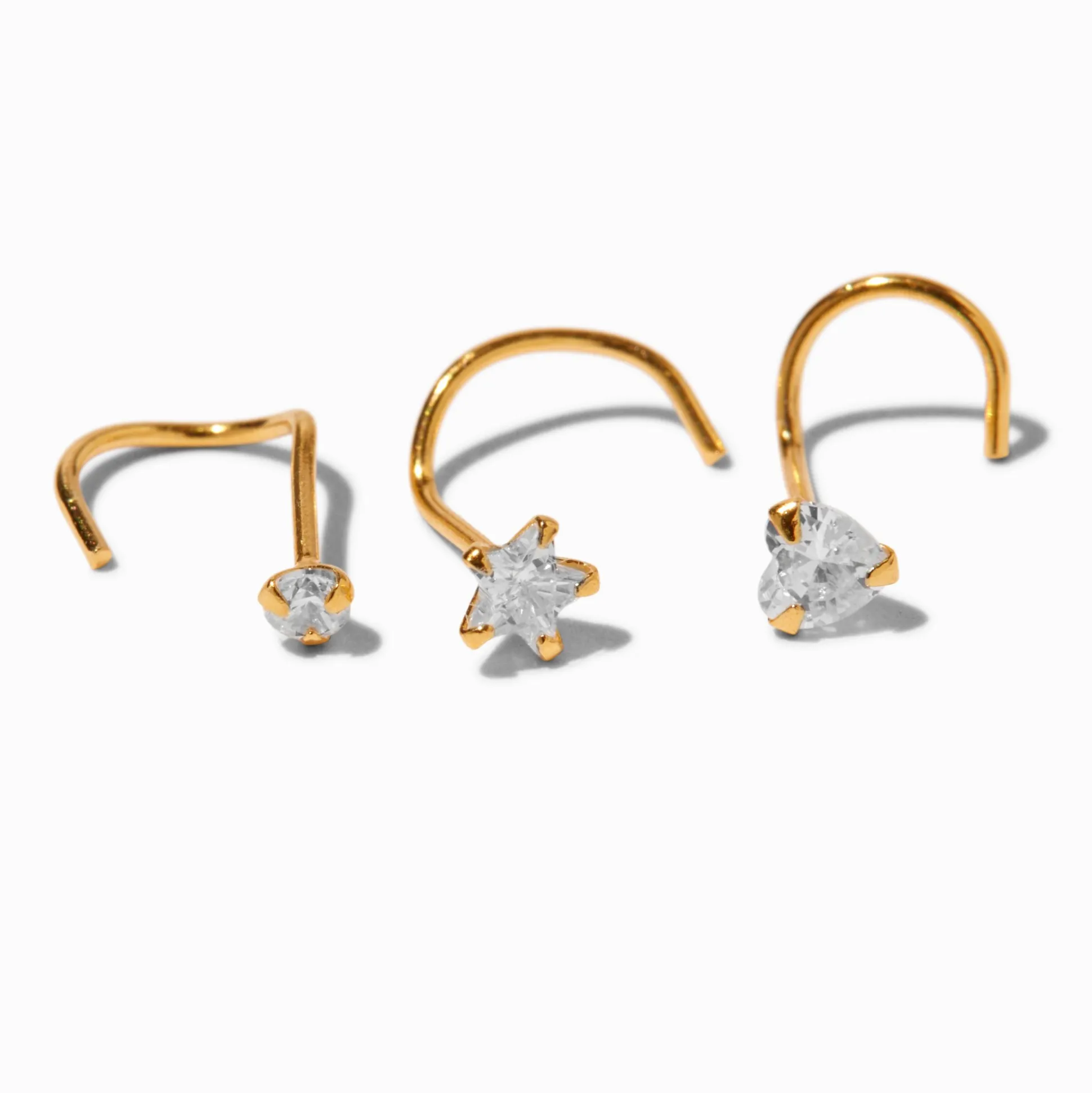 Always have the perfect crystal-accented nose stud with this trio. The three options include ball, star, and heart.