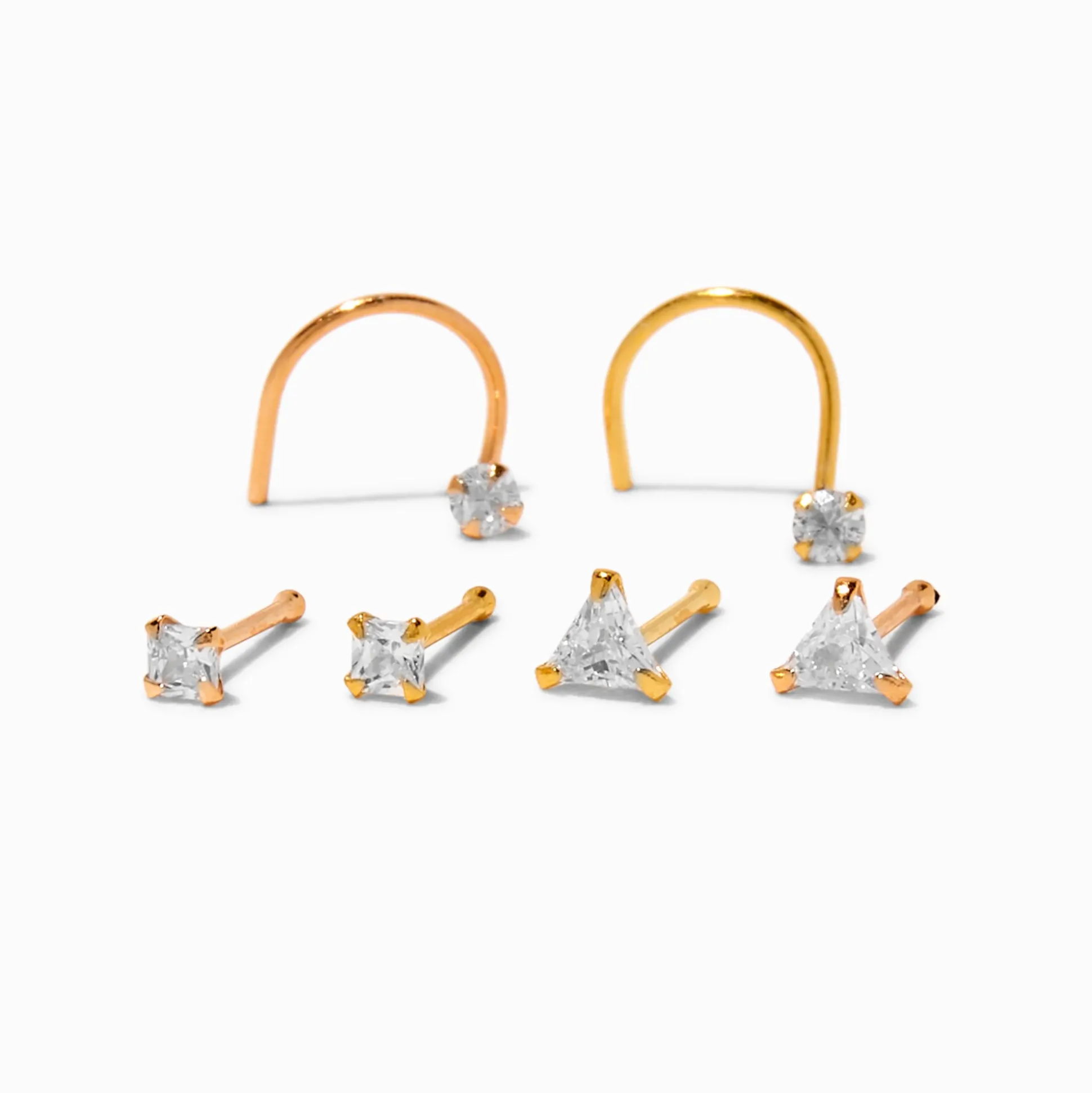 Always have the perfect crystal-accented nose stud with this expansive set. The six options include a round, a square, and a triangle faux crystal in gold- and rose gold-tone finishes.