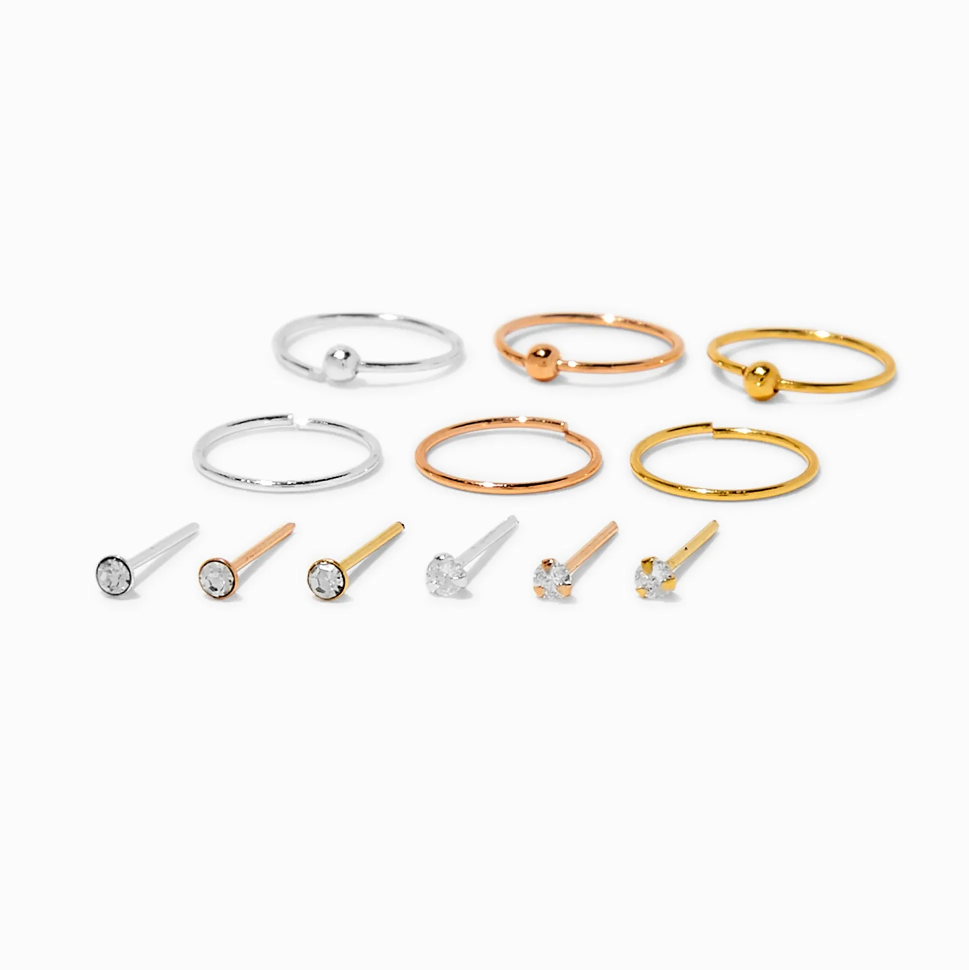 This 22G nose studs and hoop set gives you plenty of variety. Includes 6 studs and 6 hoops with in silver-tone, gold-tone, and rose gold-tone finishes.