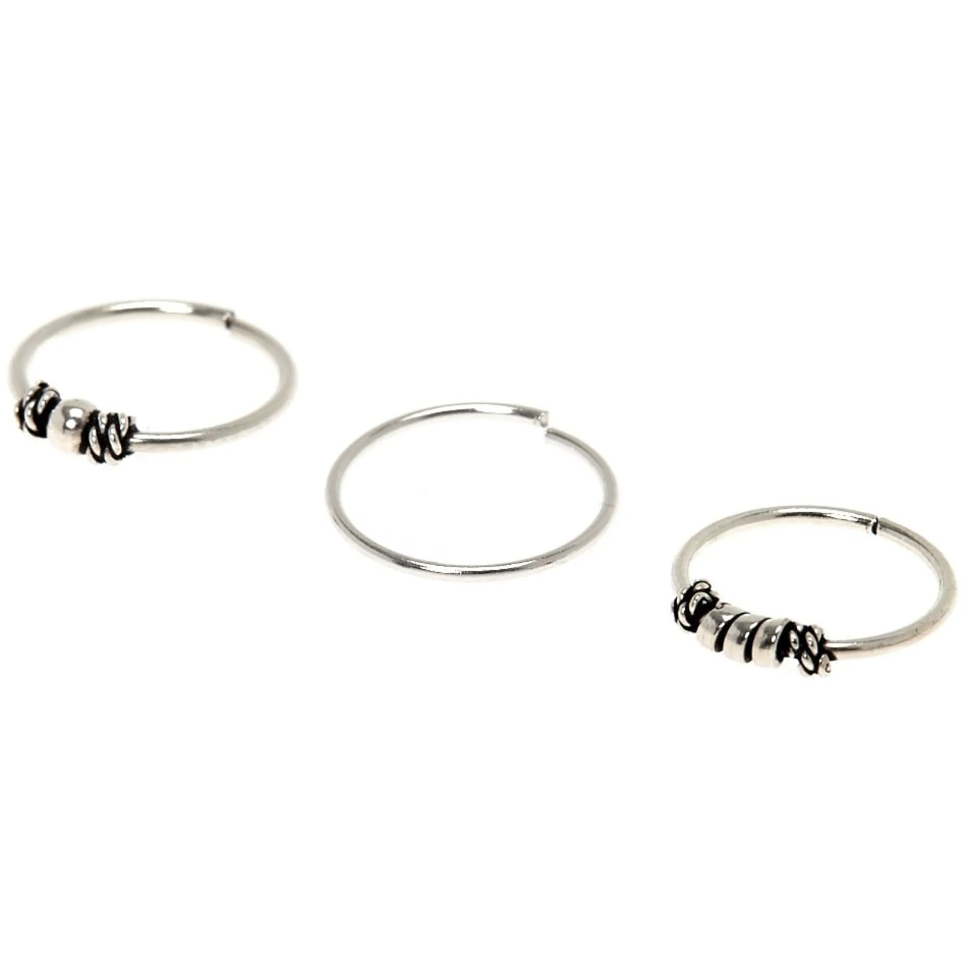 Rock a Bali inspired look with the perfect set of hoop nose rings! This pack includes 3 sterling silver hoop nose rings with different designs of beads, as well a simple sleek hoop.