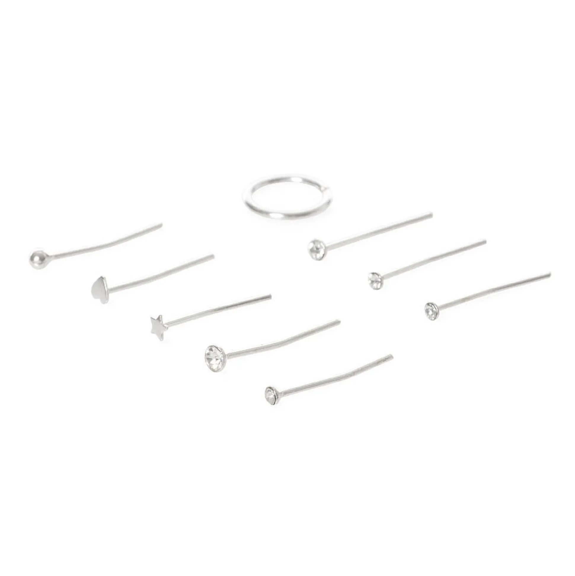 This 22G nose studs and hoop set gives you plenty of variety. Includes 8 studs: 1 silver ball, 1 silver star, 5 clear crystal and 1 silver heart. A silver hoop completes the set.