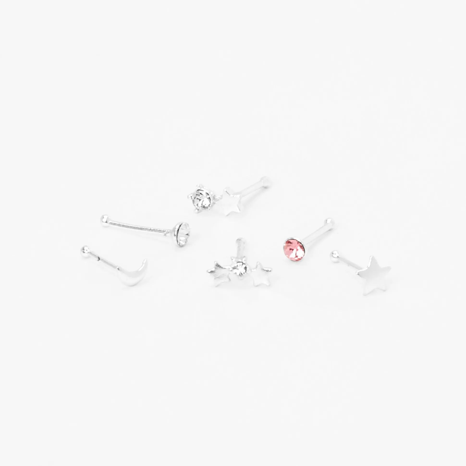 Mix it up with a new set of nose studs! Mixed sterling silver set includes stars, moons, and a sparkly pink faux crystal.