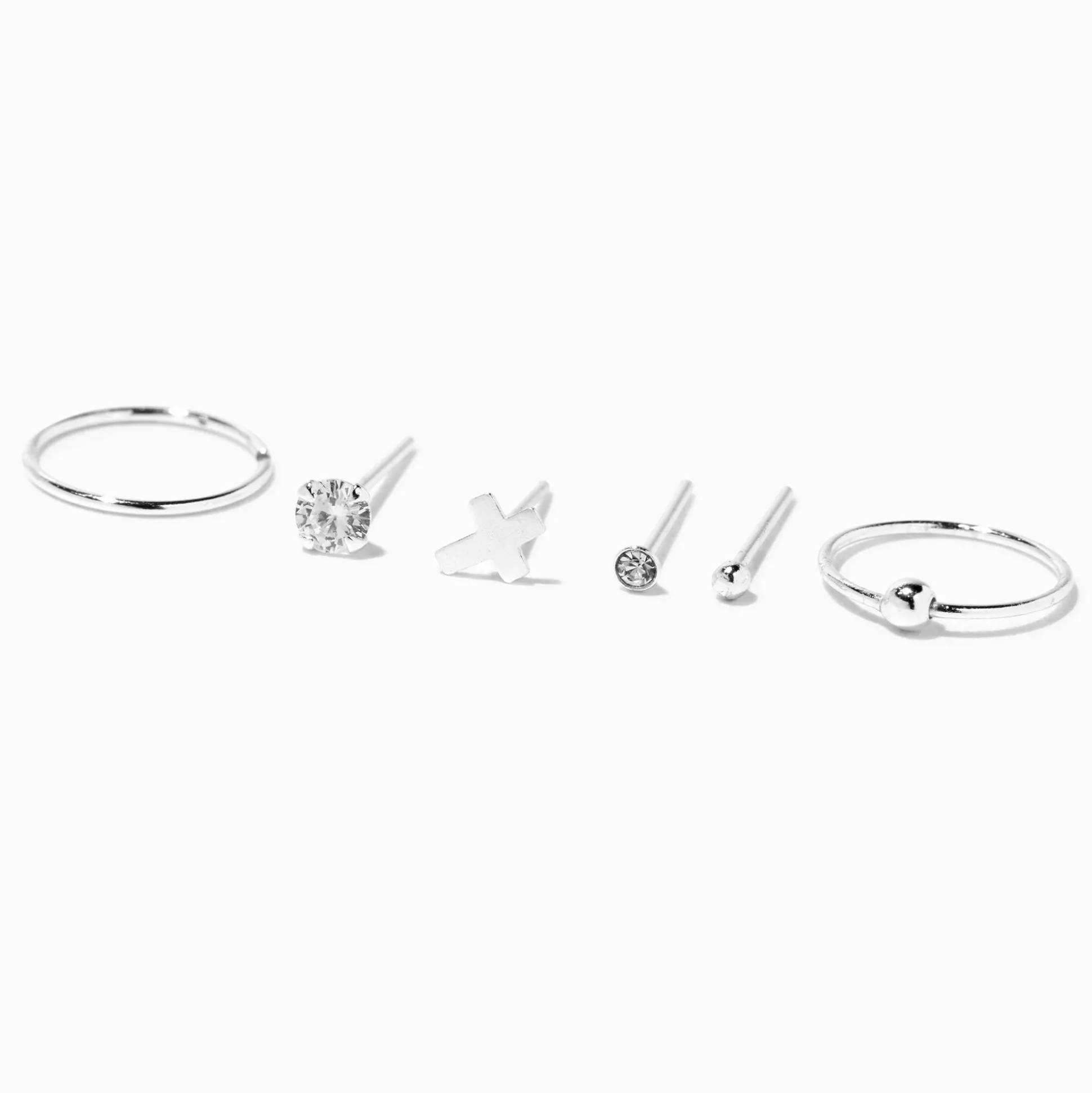 Expand your nose jewelry collection with this expansive set. The sterling silver set includes a plain hoop, a hoop with a ball, and four studs — faux crystal embellished, a cross, and a ball details.