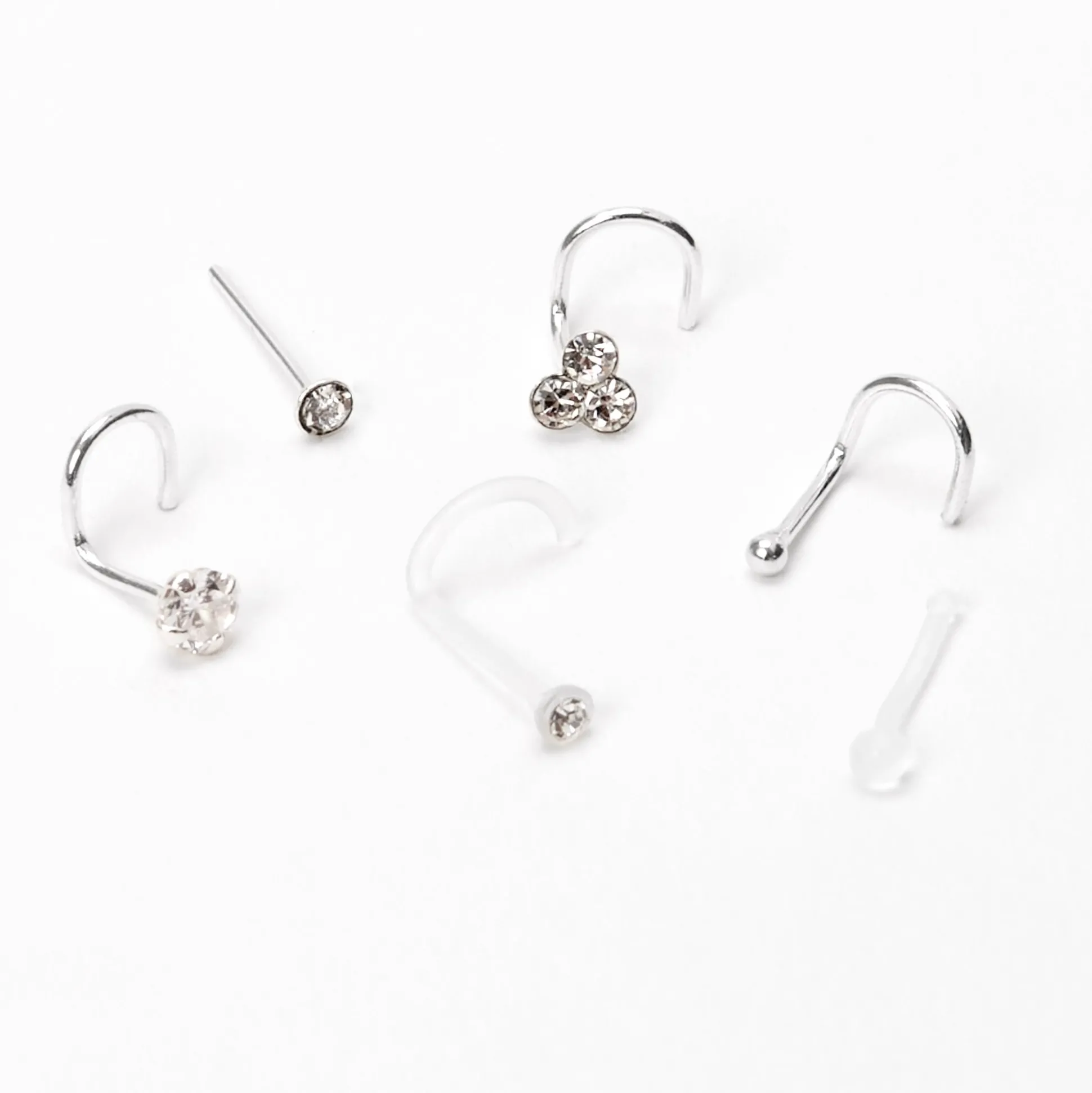 Give your everyday nose jewelry a pop of sparkle with this must-have set! Sterling silver and plastic set includes a mix of 6 different nose studs with faux crystals, balls, clear retainers, and bezel settings.