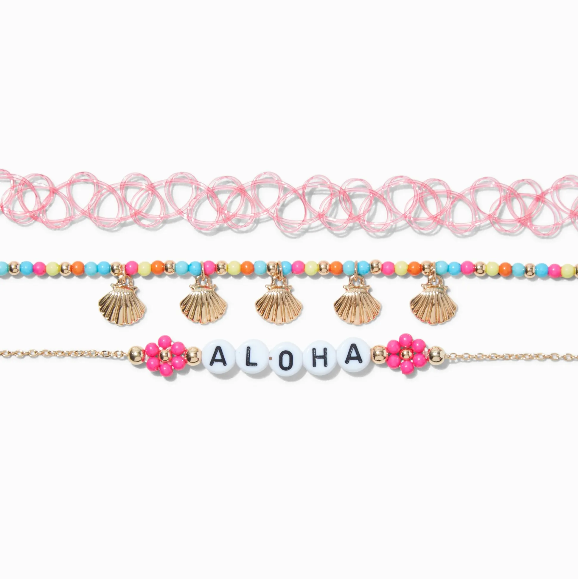 Give yourself vacay-inspired options with this choker set. The three pack has a pink tattoo-style choker, a beaded chain with gold-tone scallop seashells, and a chain that has “Aloha” in alphabet beads.