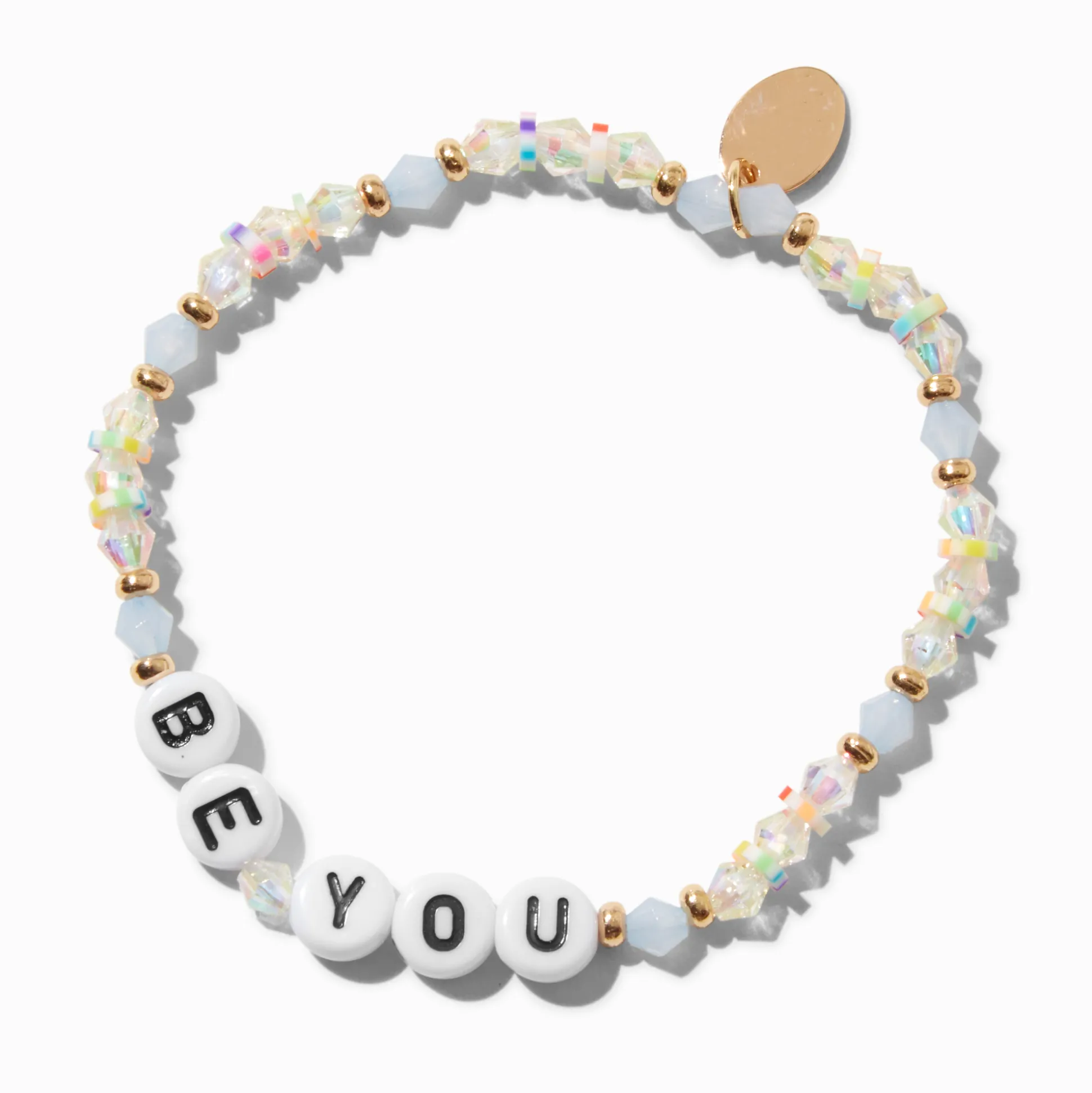 Just be you in this gold-tone bracelet. The stretch bracelet has iridescent white beads, and “Be You” in alphabet beads.