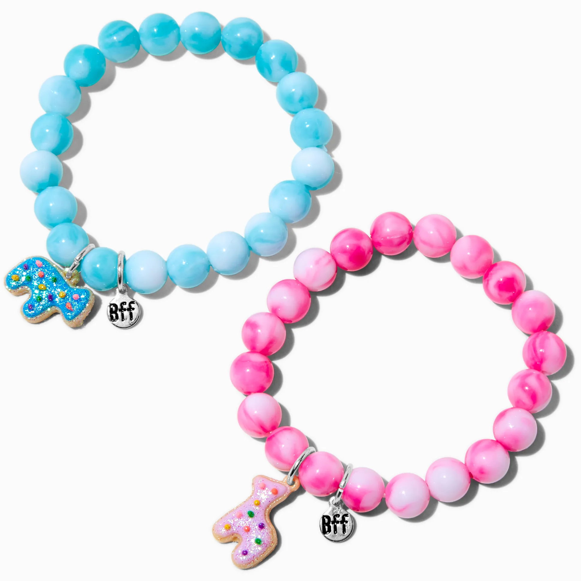 Celebrate the sweet times with your bestie in these animal crackers-inspired stretch bracelets. The two-pack set includes a blue and a pink option. Each have a glittery animal cracker pendant and a tiny “BFF” charm.
