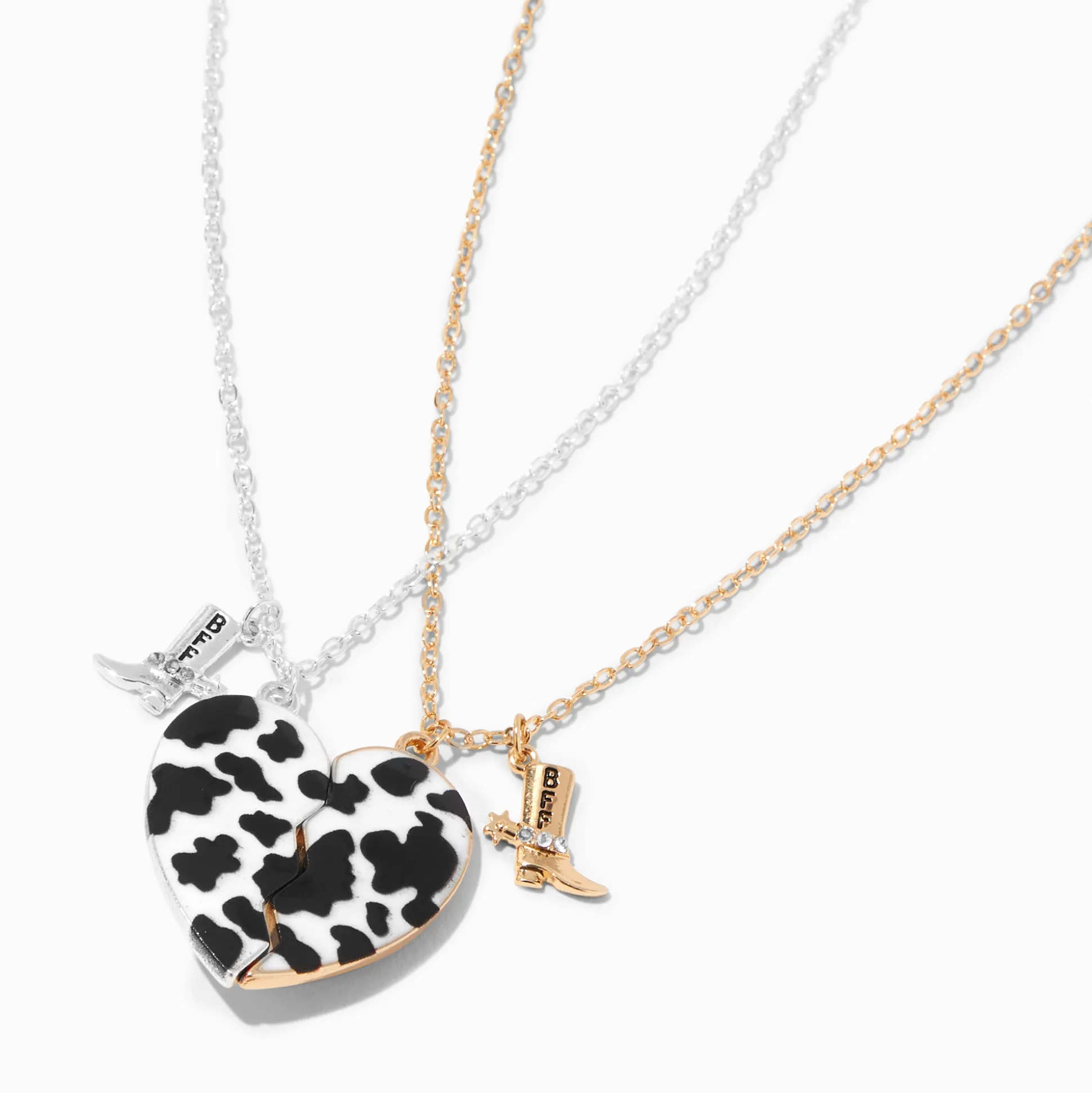 Show off your bestie moo love with this best friend necklace set. It includes two pendant necklaces that share a split heart design. Each side has a funky cow print and a cowboy boot with “BFF” on it.