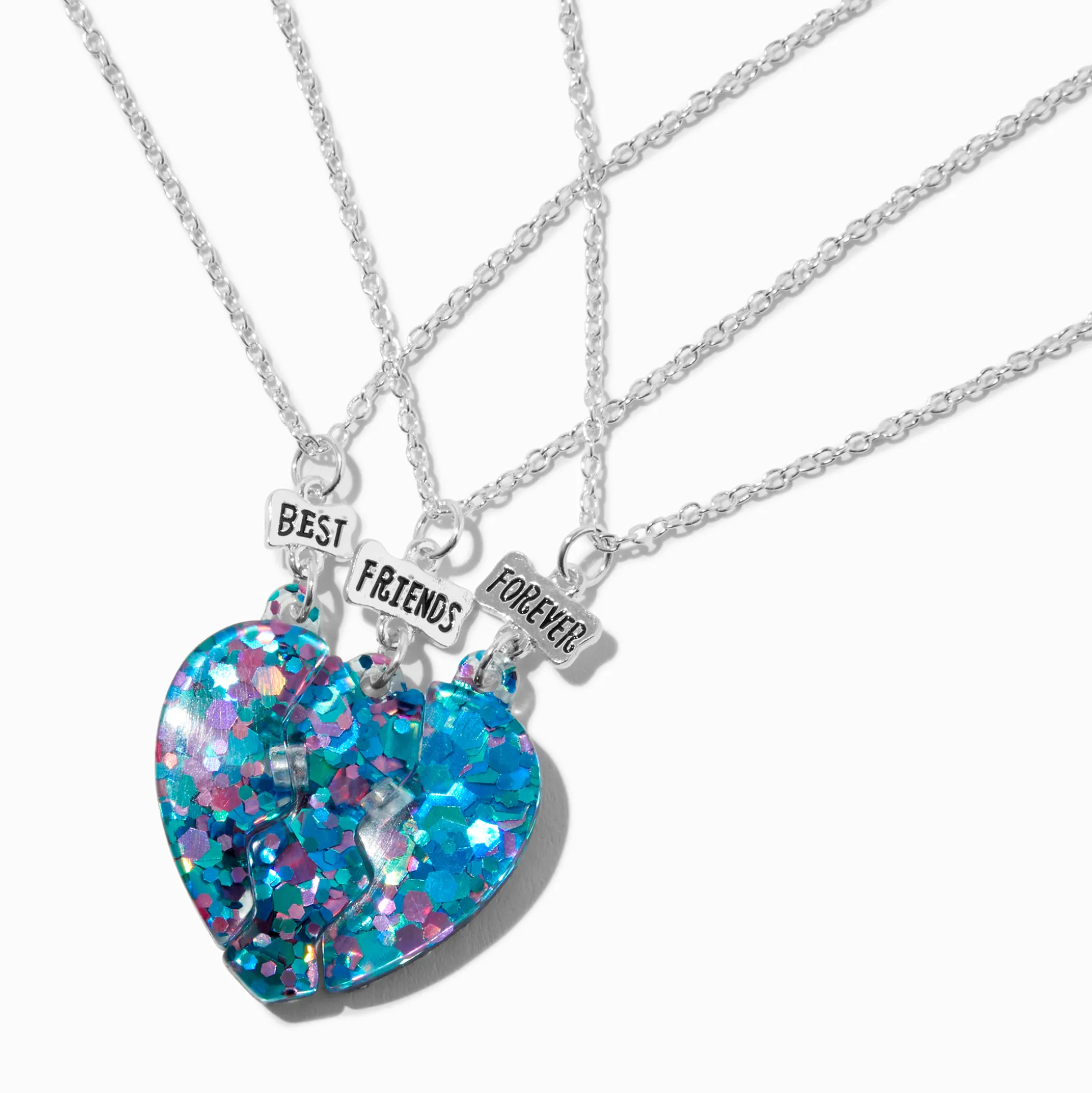 This set of pendant necklaces will have you and your BFFs matching! Set of 3 breakapart heart pendants feature blue and pink glitter flecks with silver-tone hardware.