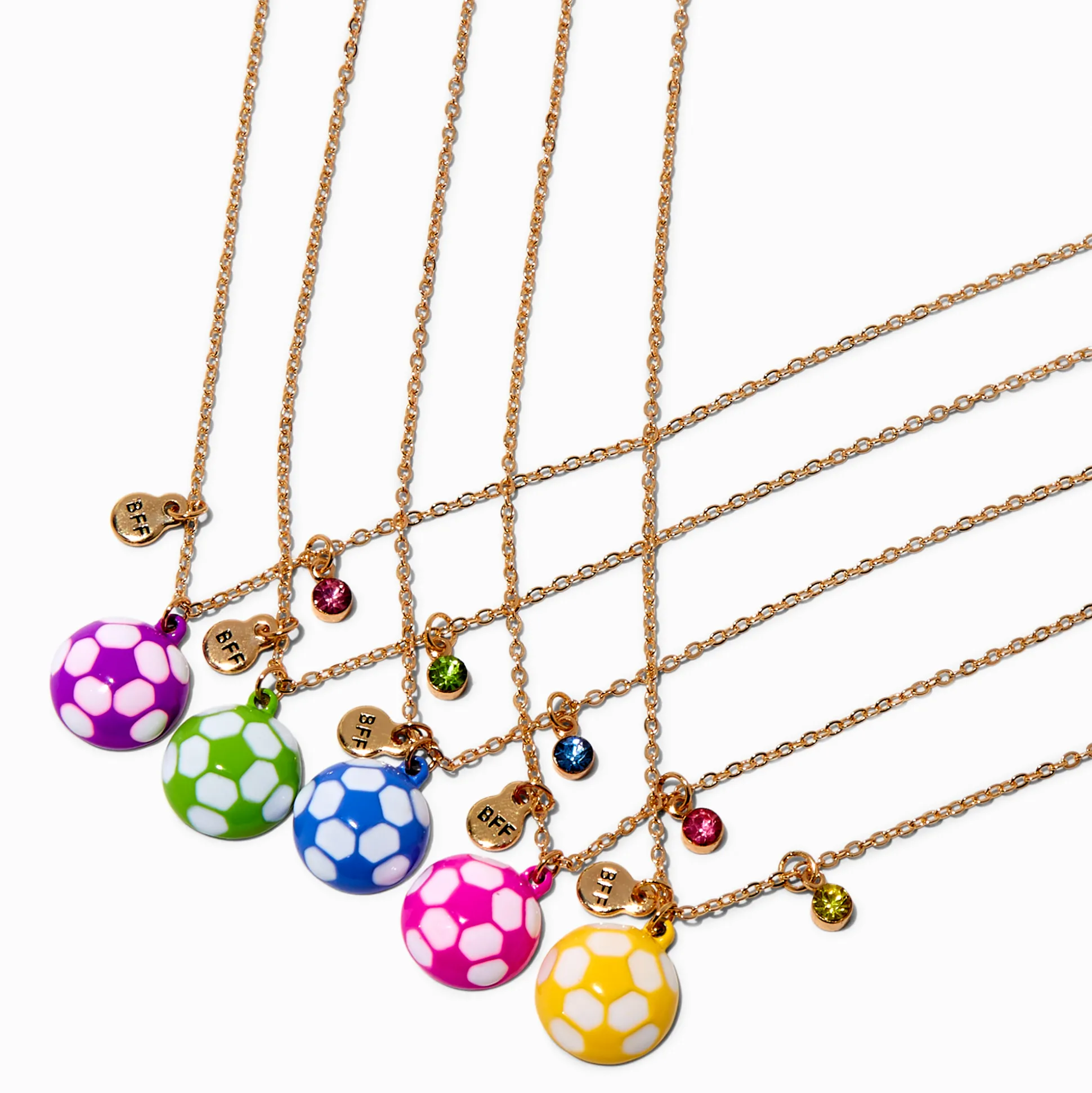 Your soccer teammates are your besties, right? Kick that bond into the goal with this five-pack necklace set. Each gold-tone necklace has a different-hued soccer pendant and “BFF” dangler. Keep one for yourself and share the other four with your teammates.