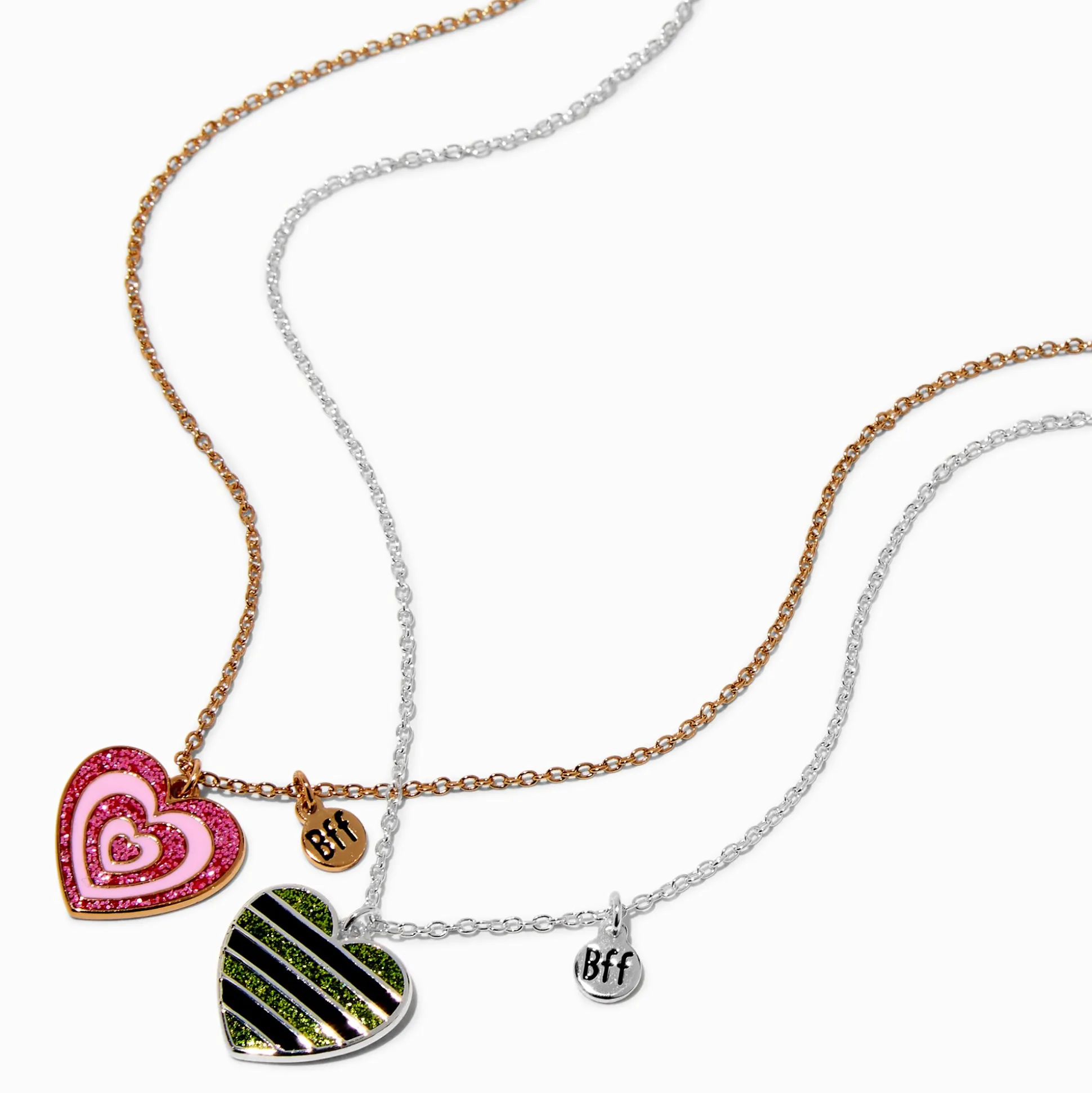 Share this bewitching set with your friend to show just how strong your friendship is! The two-pack necklace set includes a gold-tone necklace with a glittery pink, pulsating heart charm. The silver-tone necklace has a coordinating design with a black and green glitter stripes.