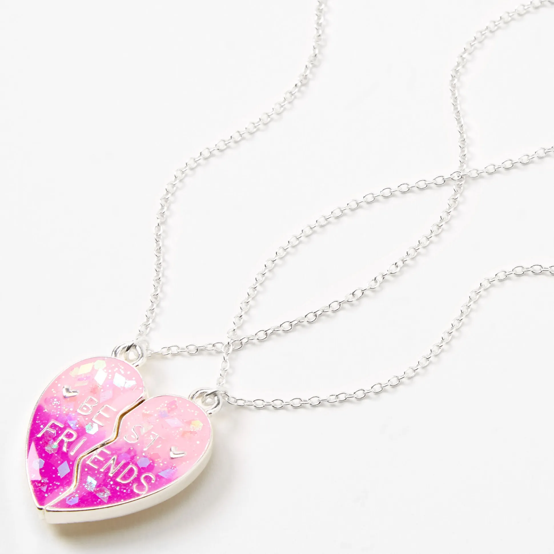 One for you, and one for your BFF! Each necklace features half of a glow in the dark, pink ombre heart that’s embellished with a festive confetti design.