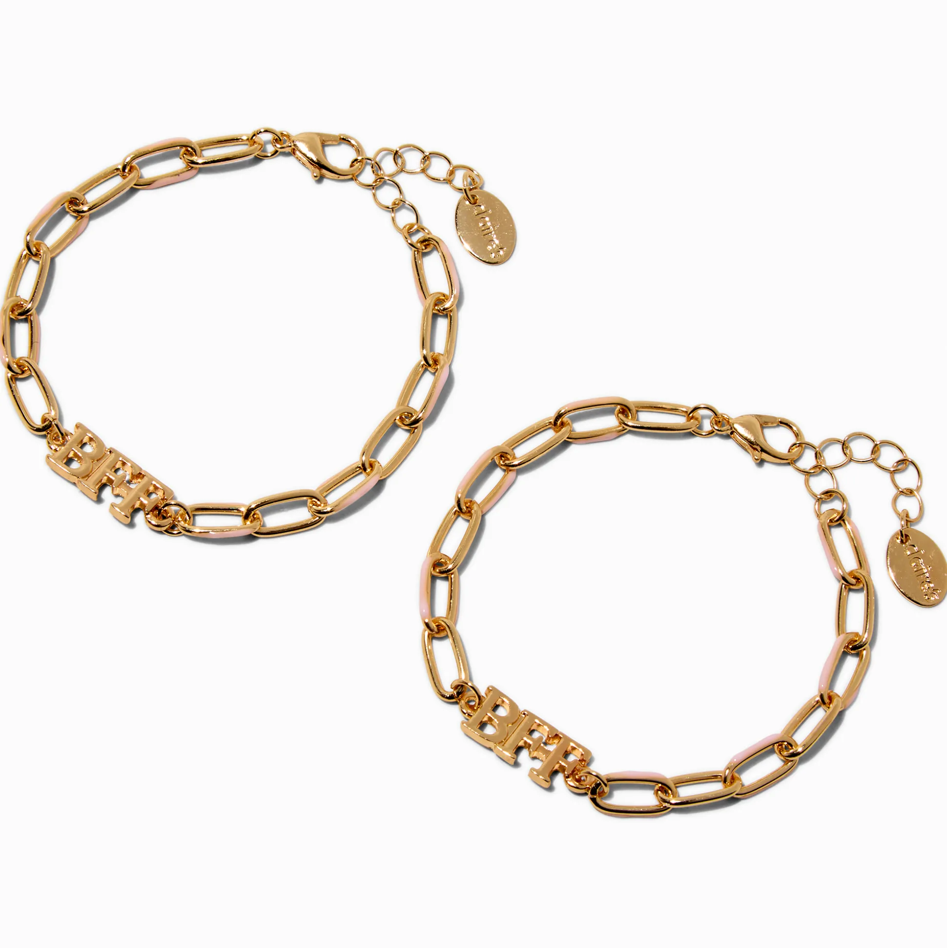 Show off your love for your bestie with this chain link bracelet set. The gold-tone designs have “BFF” in bubble letters on each.