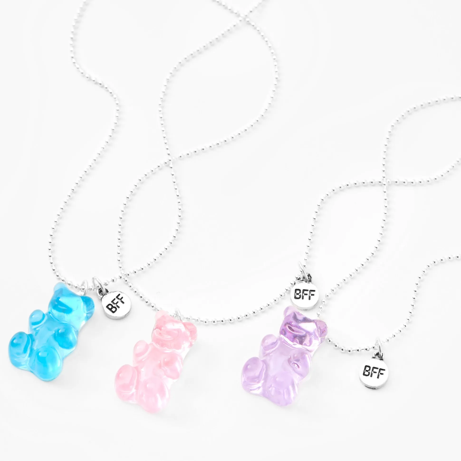Celebrate your friendships with these sweet Gummy Bears® necklaces. The set includes three silver-tone chain necklaces, each featuring translucent pastel Gummy Bears® pendant and a “BFF” charm. It’s the perfect gift to share with you and your besties!