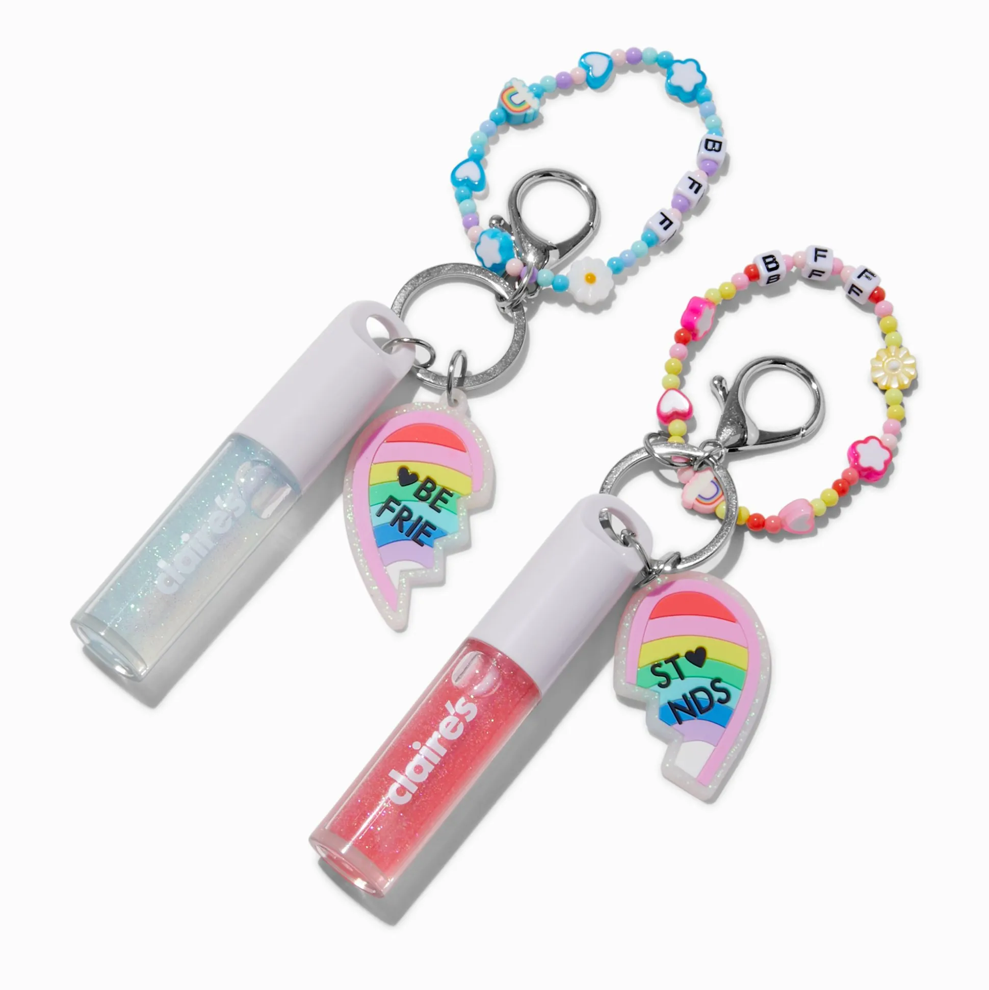 Make sure your bestie’s lips are glossy and moisturized like yours when you share this best friends lip gloss keychain set with her. The two pack has a pink and blue keychain that shares a split heart design that reads “Best Friends.” Each has a silver-tone clip to attach it to your purse, backpack, or other keychains.