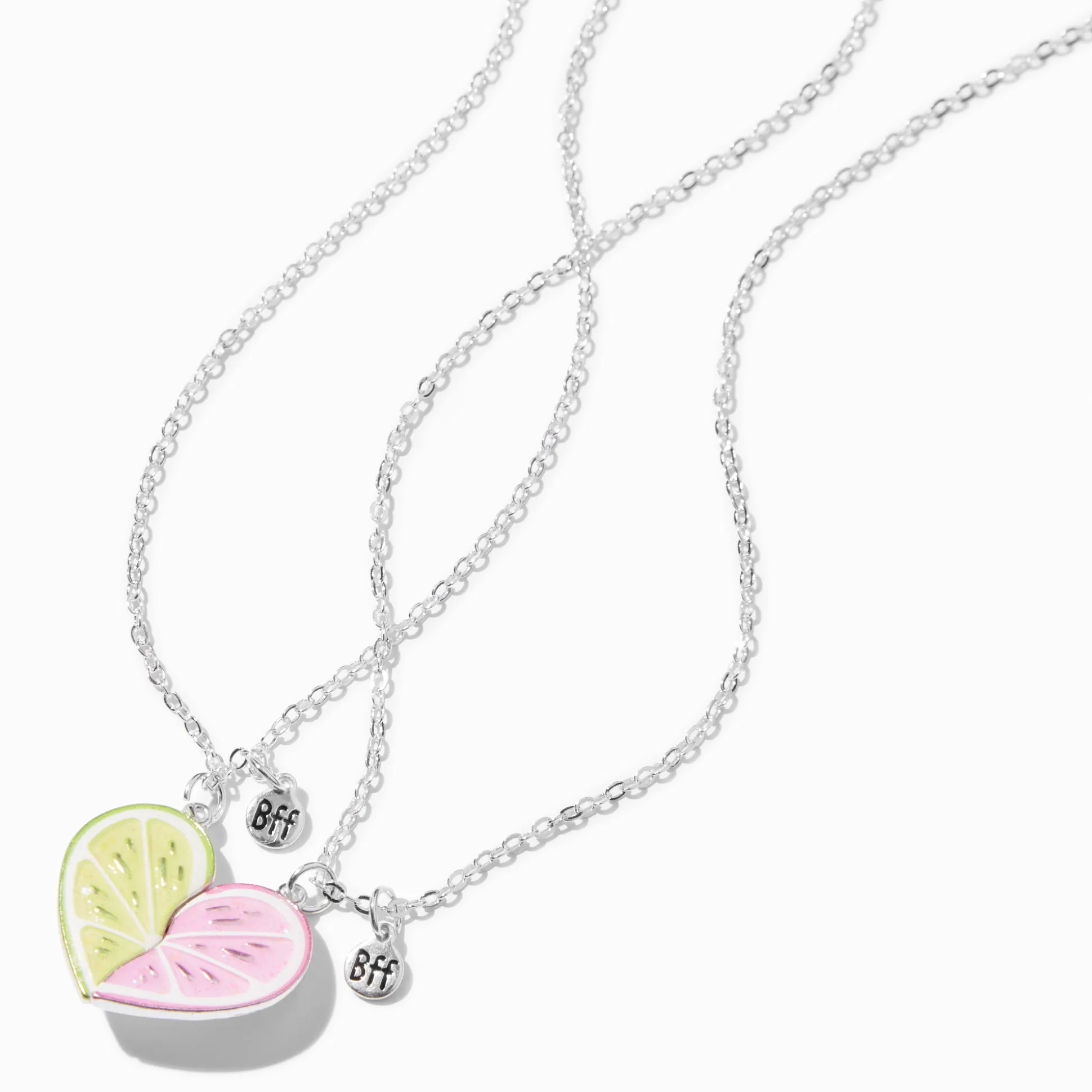 You and your bestie roll together in the fruit salad of life. Celebrate that bond with this fruity pair. It includes a lime half-heart and a grapefruit half-heart that can be connected to show your citrus style. The look is finished with small “BFF” dangling charms.