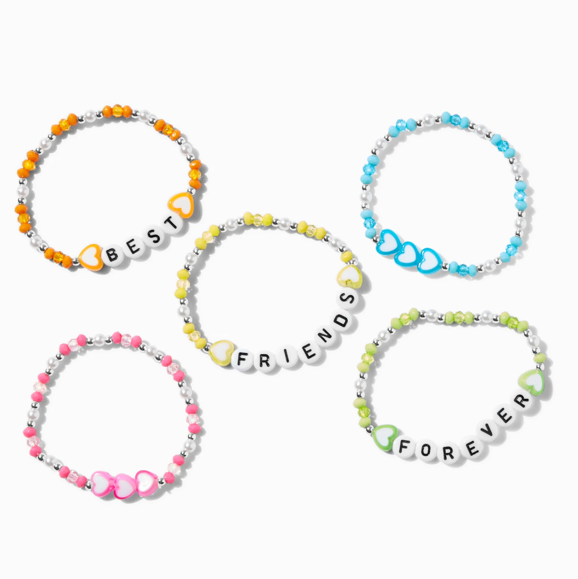 Share these bracelets with four of your besties! The five-pack set includes neon-themed bracelets, each with heart beads.