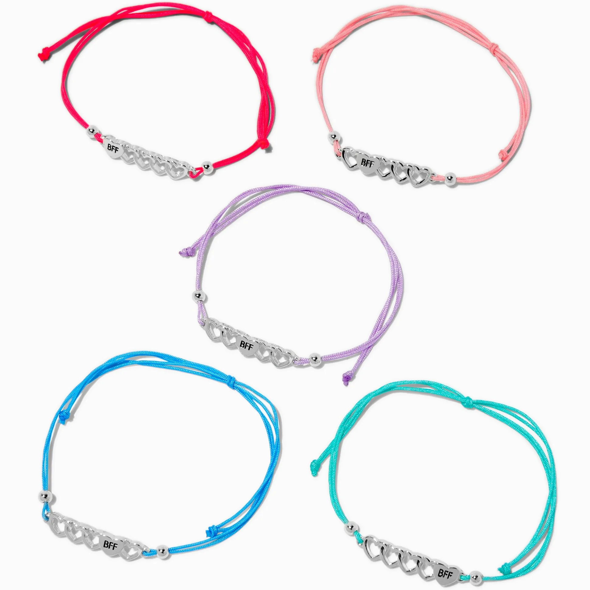Celebrate your five-strong girl gang with this best friends bracelet set. The five pack includes pink, red, purple, green, and blue adjustable bracelets with an open heart design that looks like its from a video game. Level up your friendship with this adjustable bracelet set.
