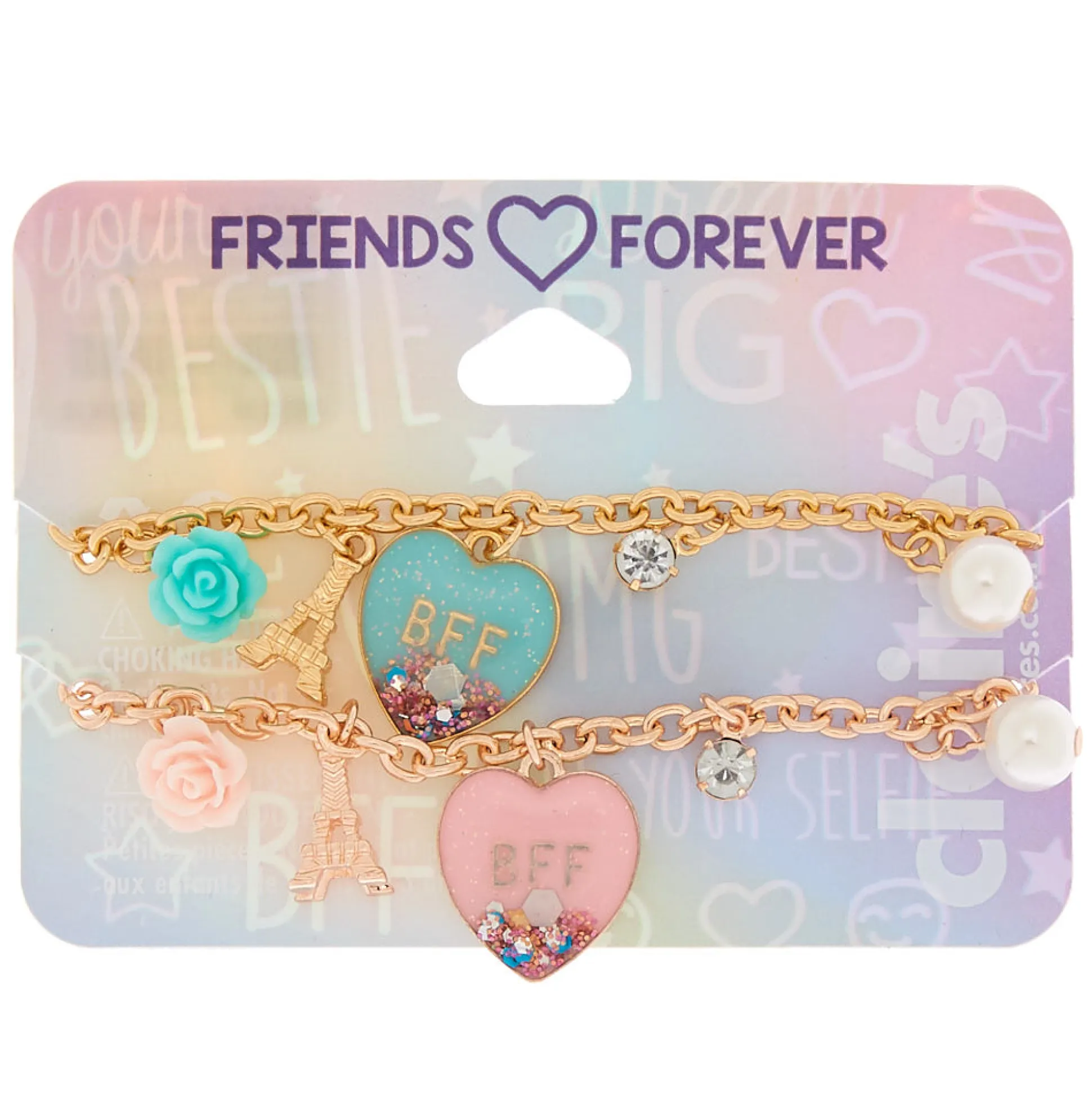 You and your bestie will look precious in these two charm bracelets! These bracelets feature Eiffel tower, heart, flower, and stone charms.