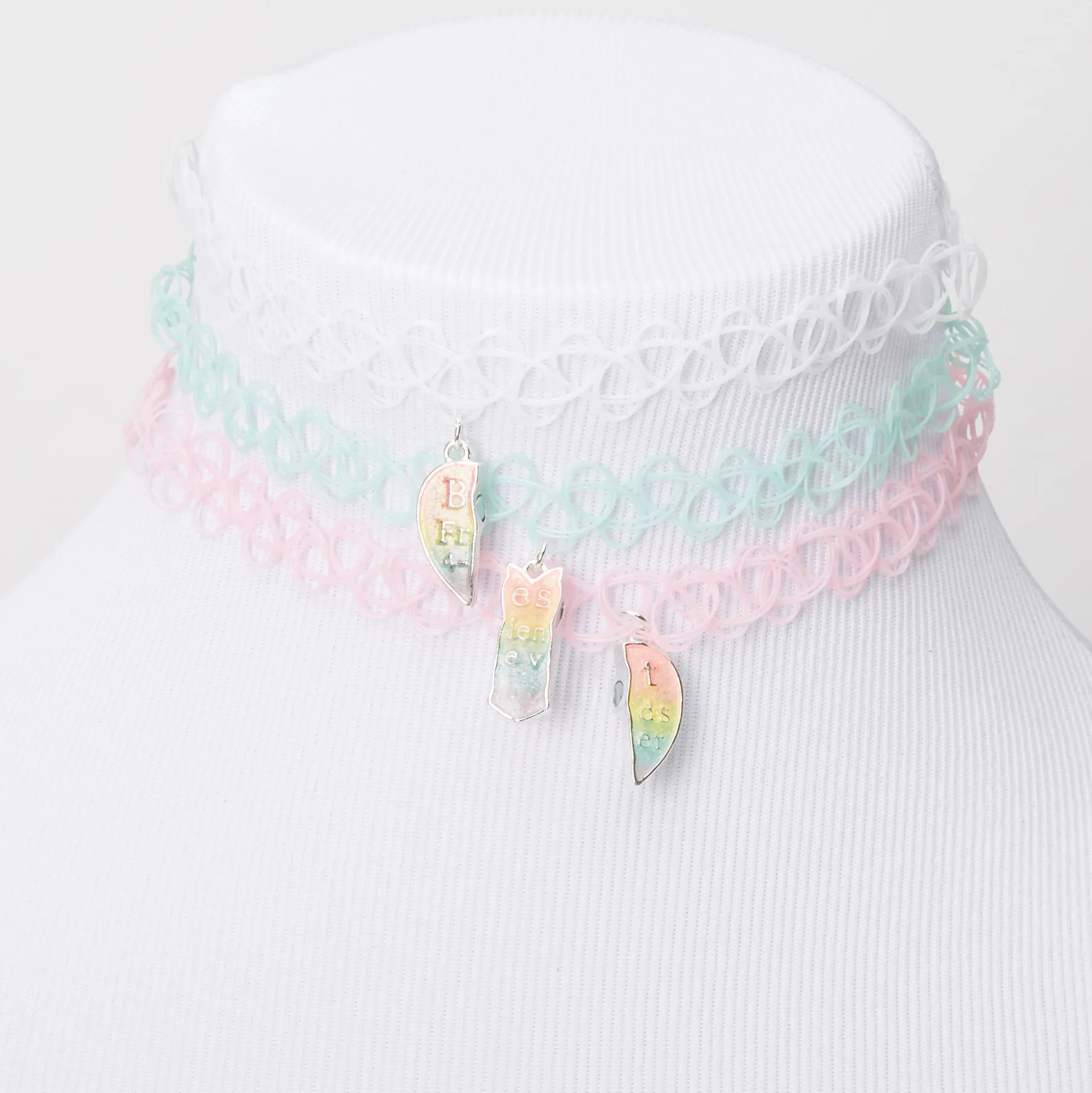 Show some love to your BFFs with matching choker necklaces! Set features a white, blue, and pink tattoo choker necklace with a piece of a magnetic heart pendant in the center of each one. Pendants glow in the dark!