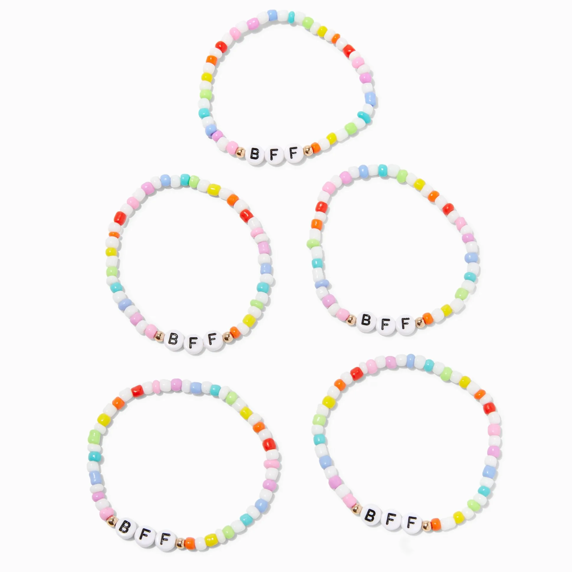 Grab your four besties and coordinate with these mega cute bracelets. This set includes five rainbow beaded bracelets with “BFF” beads.
