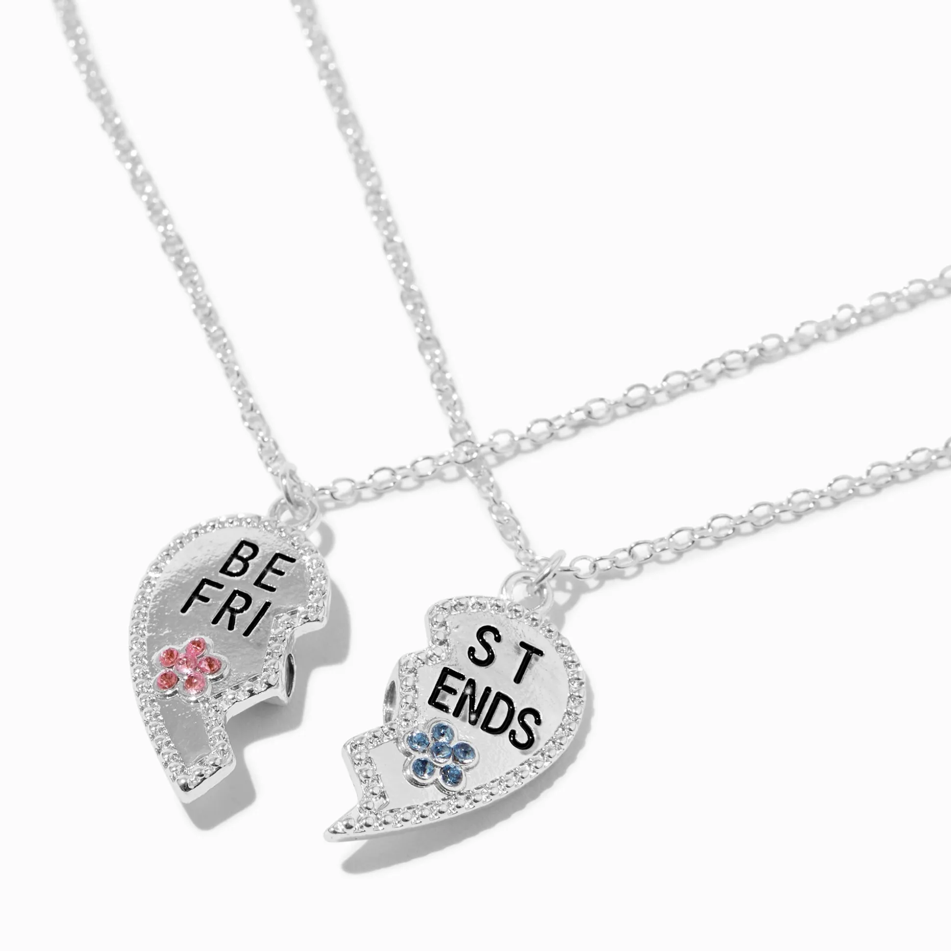 Show off your bestie love with this best friend necklace set. It includes two pendant necklaces that share a split heart design. The split design has silver-tone detailing and rhinestone flowers.