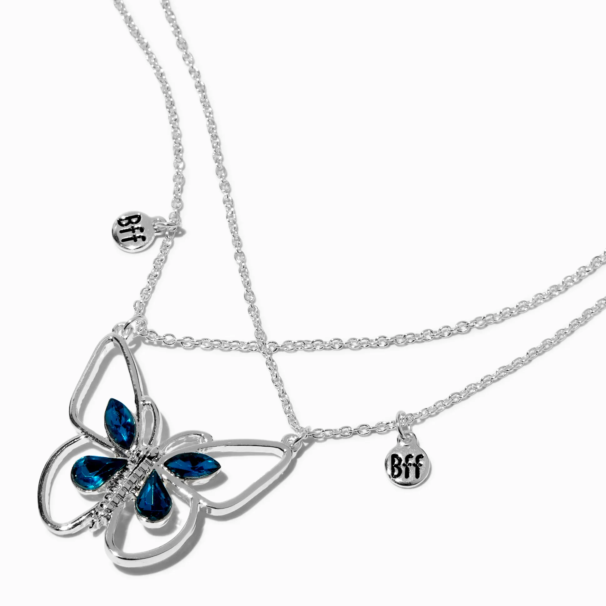 Celebrate your friendship with your best friend with this beautiful necklace set. The silver-tone set has two halves of a butterfly pendant each with a turquoise faux gem. Each is finished with a dangling “BFF” charm.